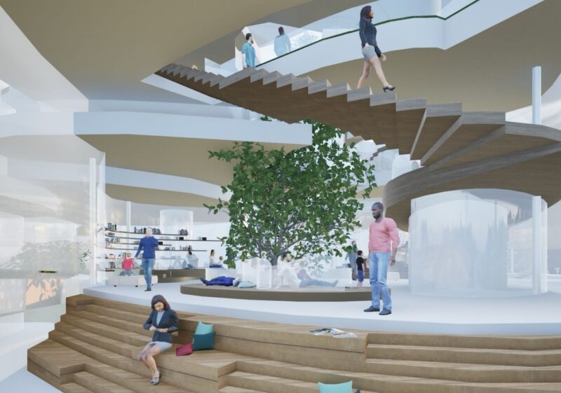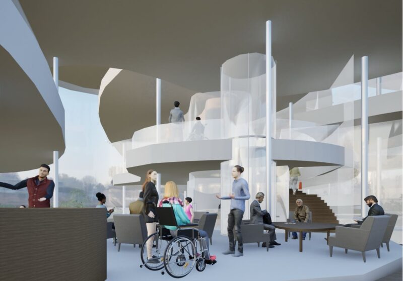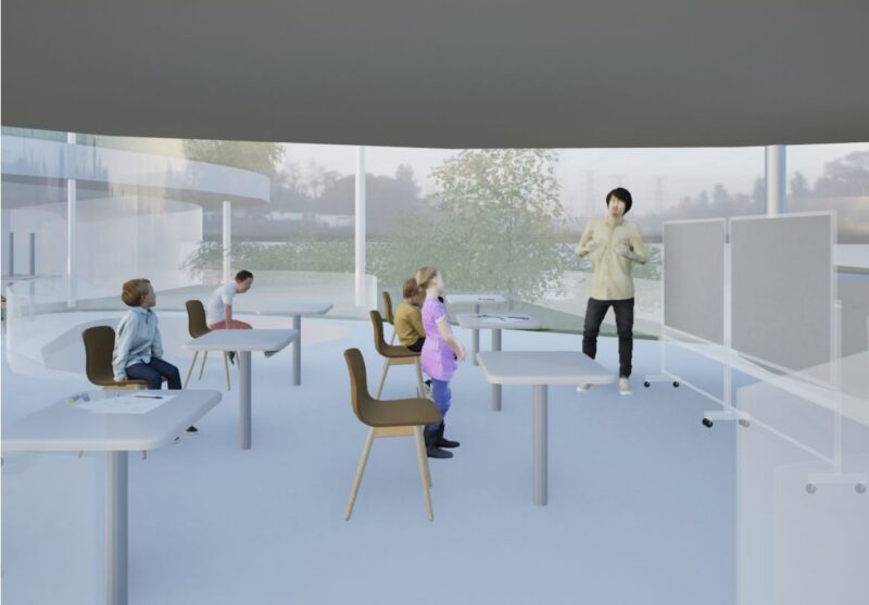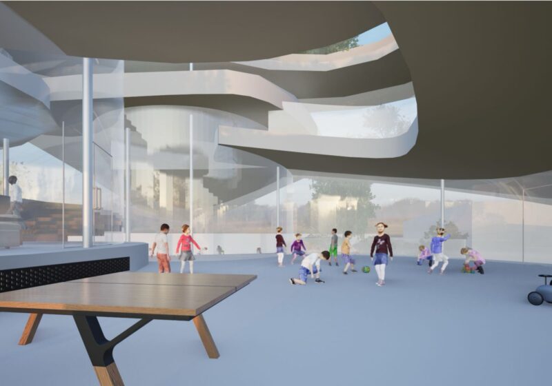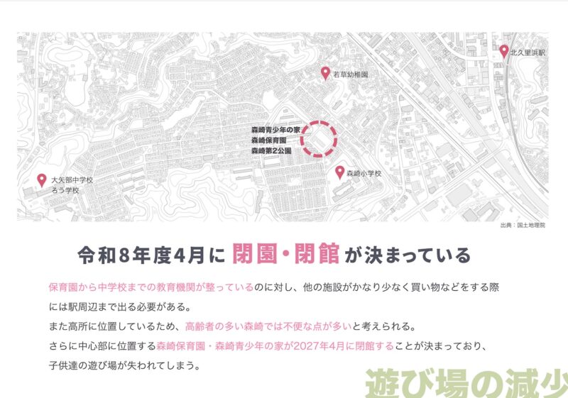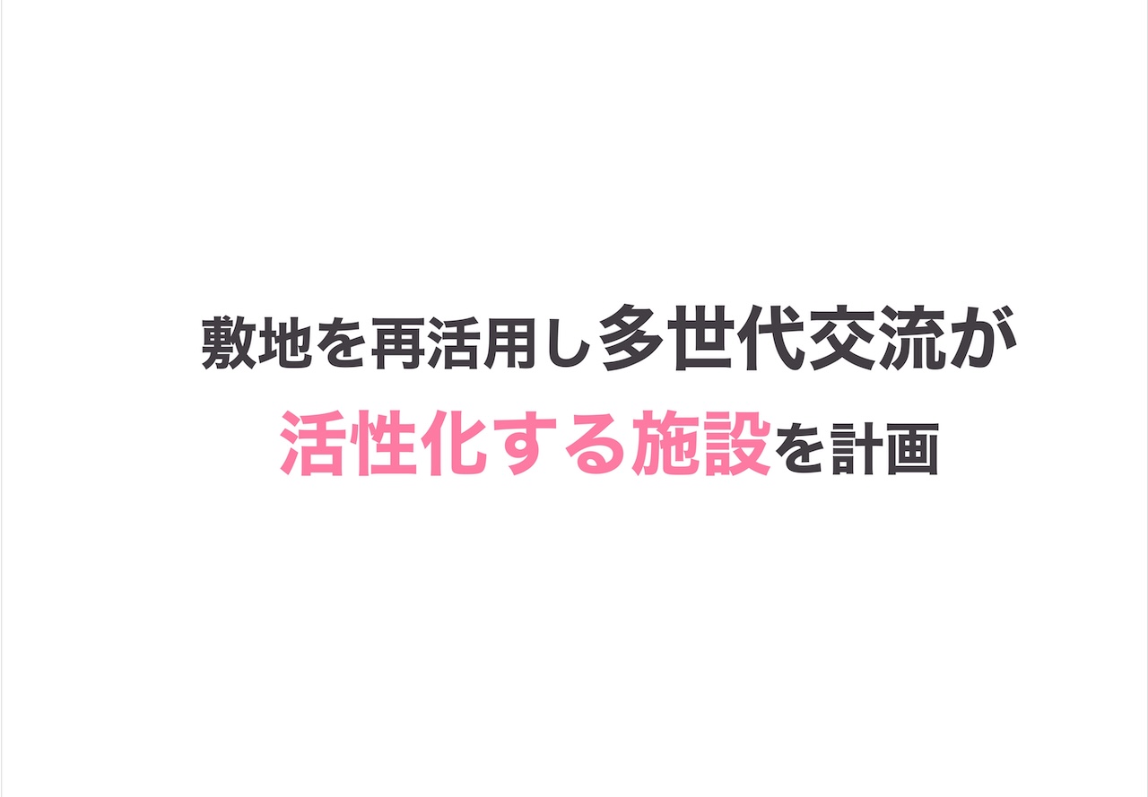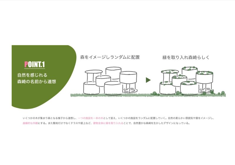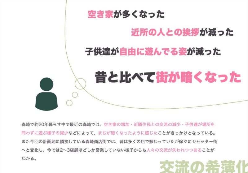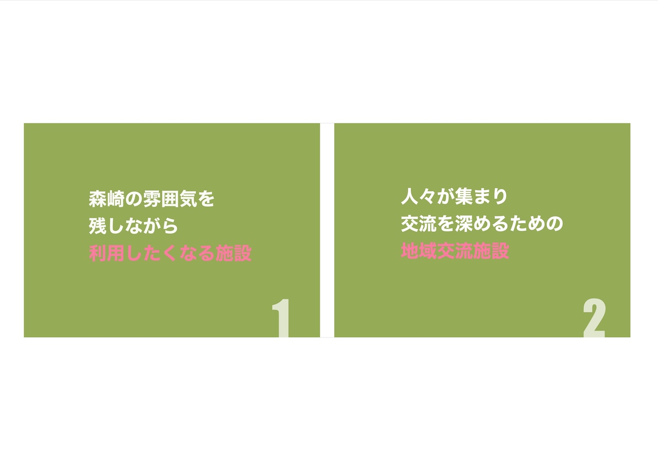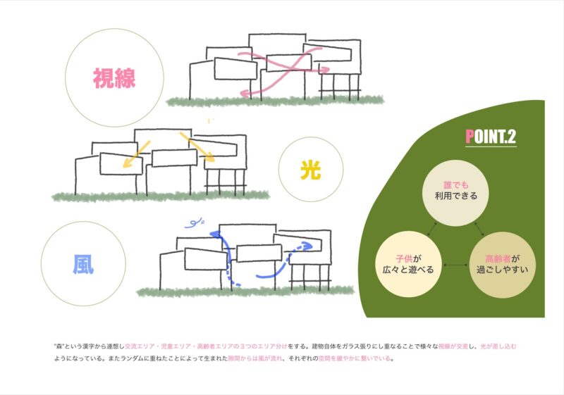 失われてしまった森崎の活気と、今後失われつつある子どもの遊び場に着目し、世代を問わず交流が生まれる地域交流施設を提案する。 森崎という地名から「森」をコンセプトとし、自然を感じられる空間構成と三つのエリア分けによって、多様な人々が緩やかにつながる建築を計画した。 本施設を通して多世代交流を再び生み出し、森崎が長く住み続けられるまちとなることを目指す。