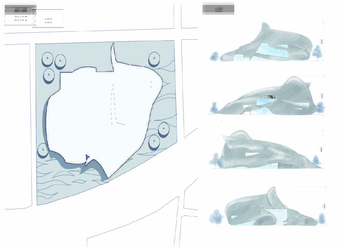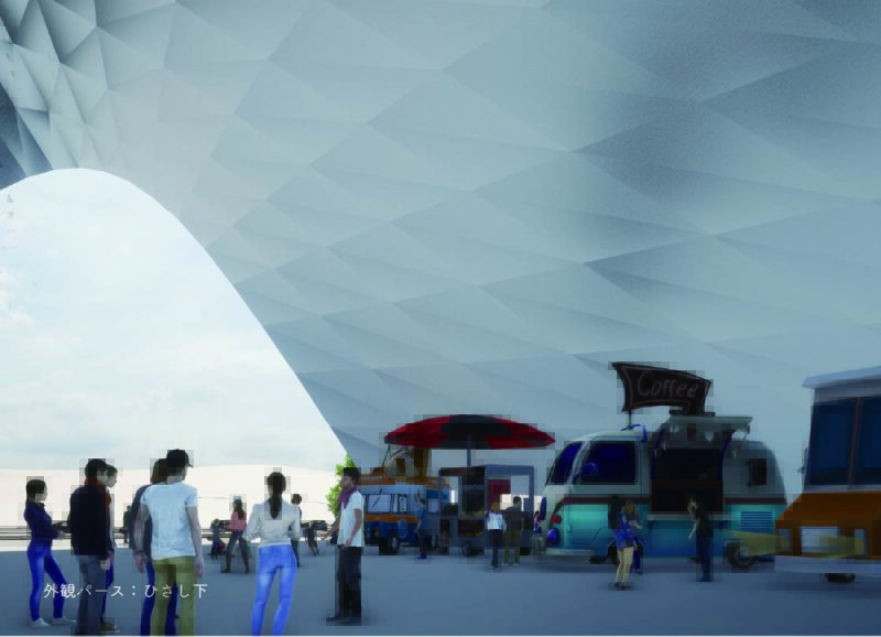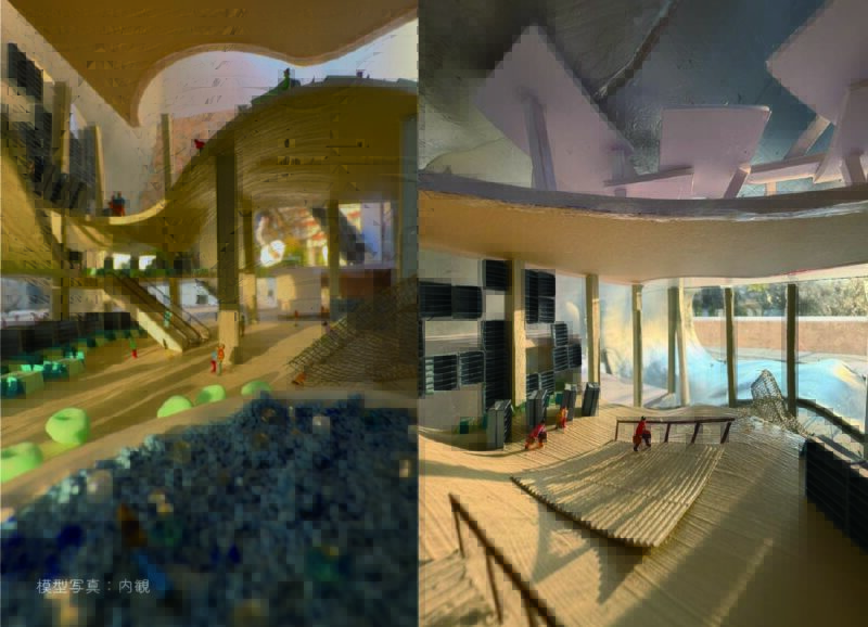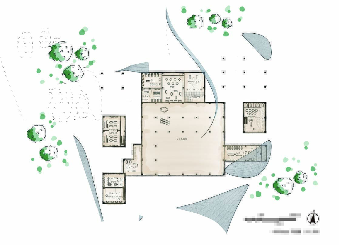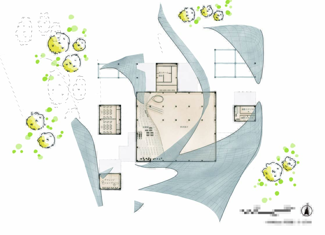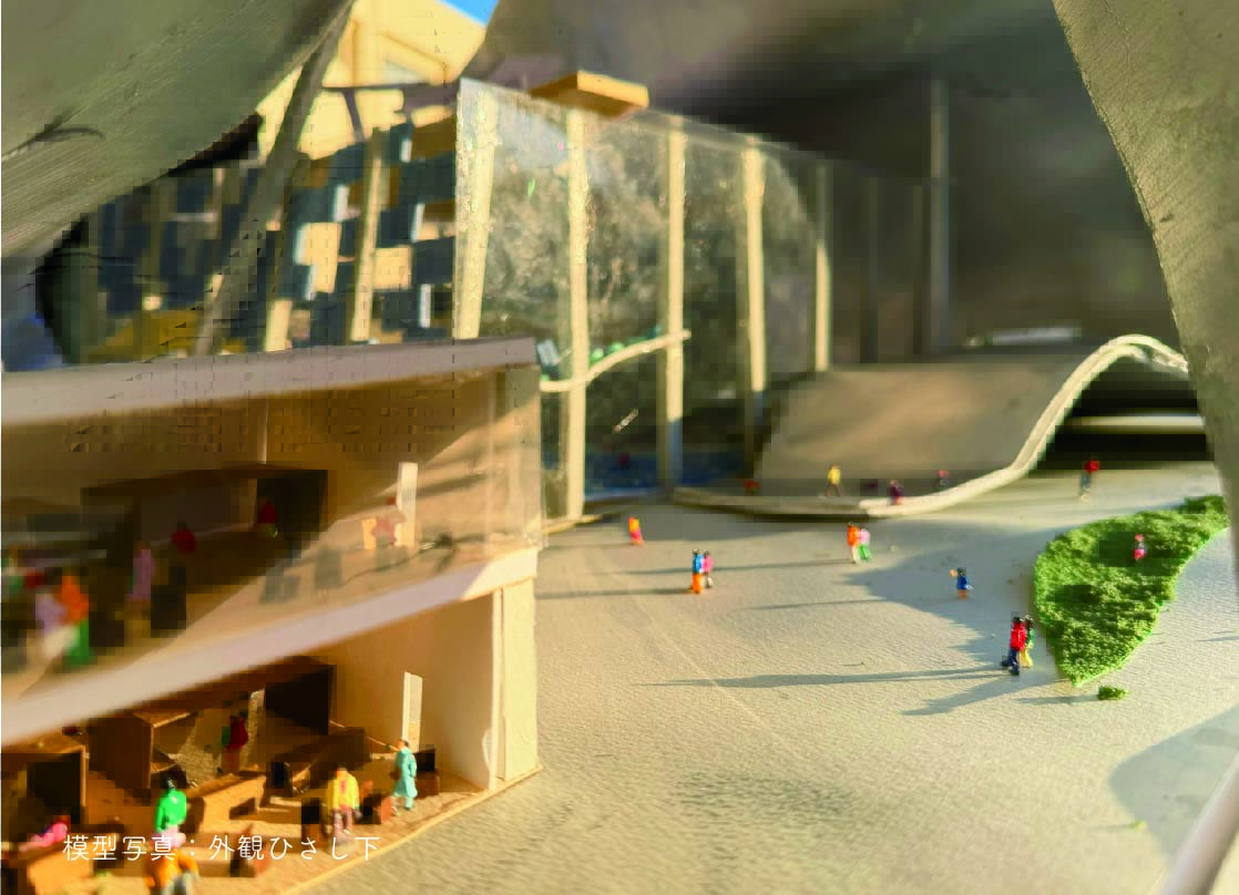 計画地の、船着場として機能していた歴史的背景を踏まえ、波を空間構成のコンセプトとした。既存躯体に入り組む形で波形の屋根を架構し、新たに形成される庇の空間を作り出す。本計画におけるその空間の在り方は、屋根のように行為全体を覆い規定するものではなく、庇のようにわずかに子供や大人の挑戦を見守る存在として構想した。閑散としていた施設に、波が打ち寄せ、再び揺れ動く場となることを意図している。