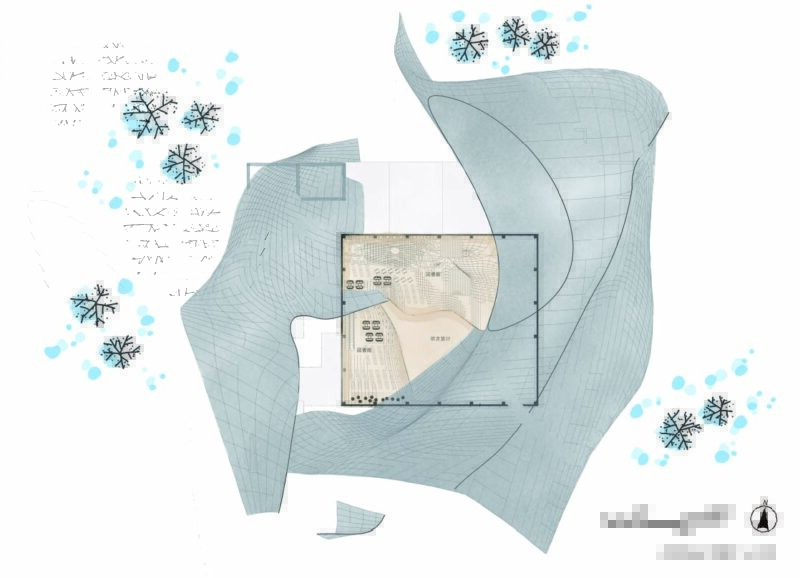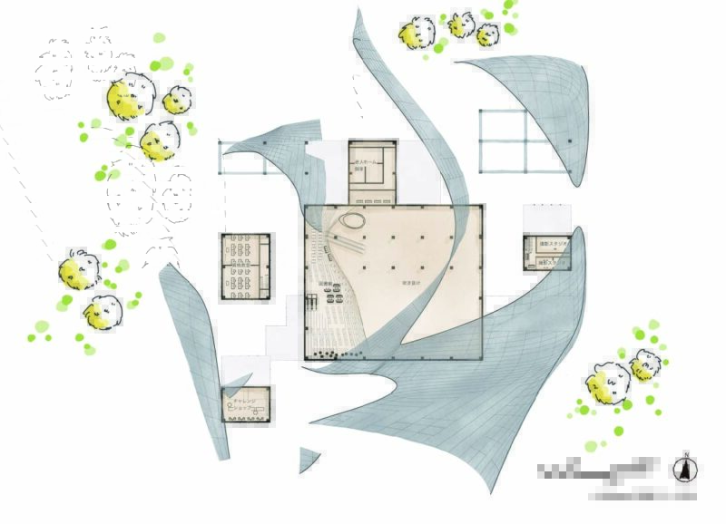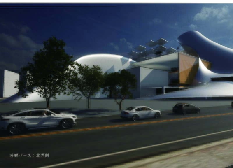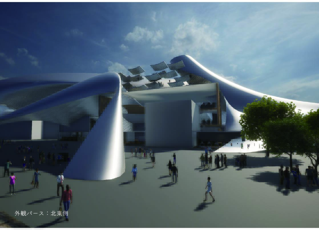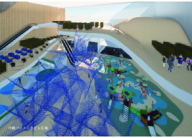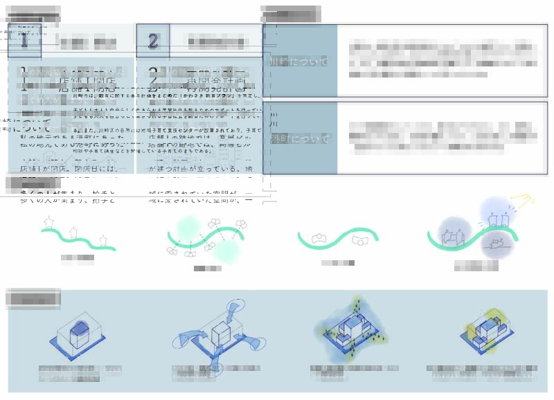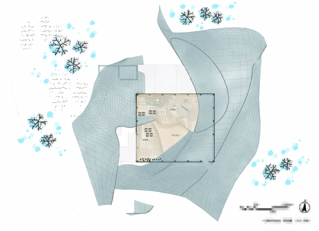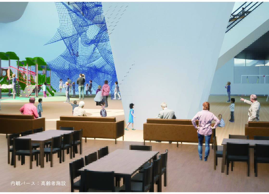 計画地の、船着場として機能していた歴史的背景を踏まえ、波を空間構成のコンセプトとした。既存躯体に入り組む形で波形の屋根を架構し、新たに形成される庇の空間を作り出す。本計画におけるその空間の在り方は、屋根のように行為全体を覆い規定するものではなく、庇のようにわずかに子供や大人の挑戦を見守る存在として構想した。閑散としていた施設に、波が打ち寄せ、再び揺れ動く場となることを意図している。