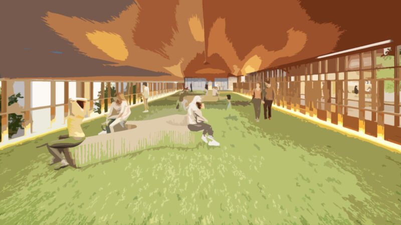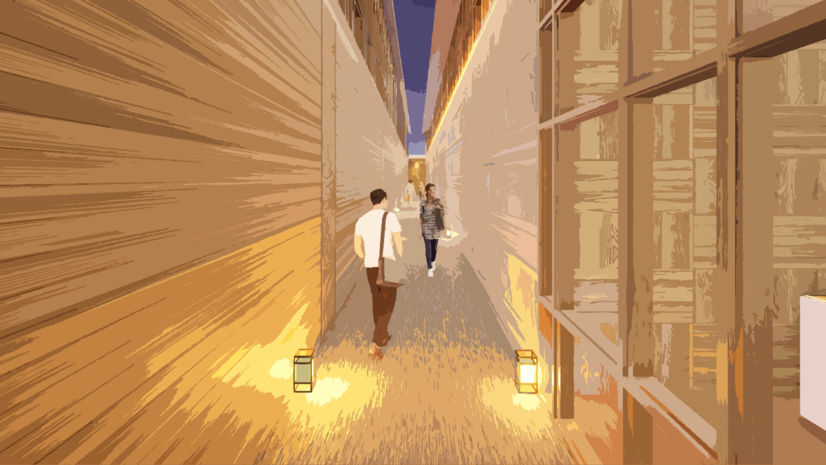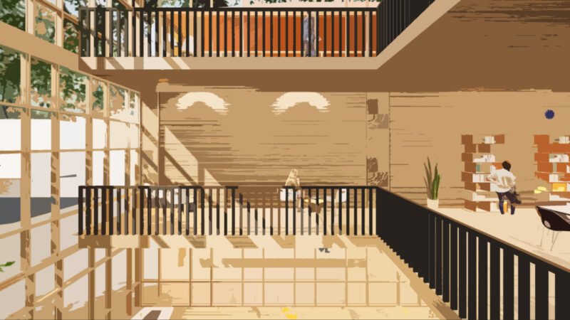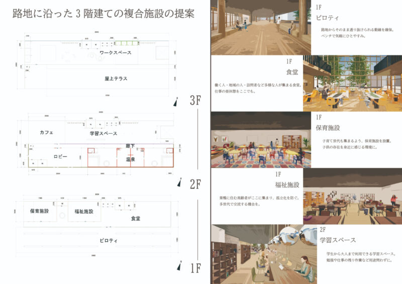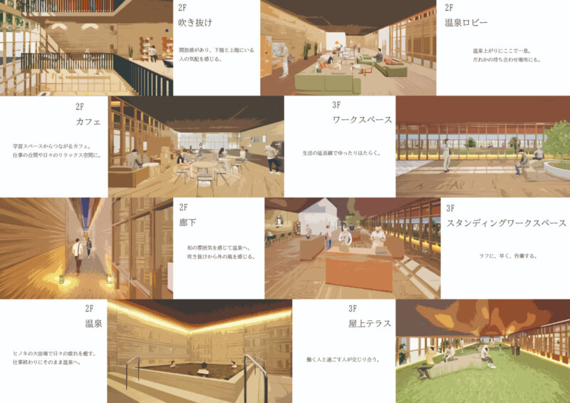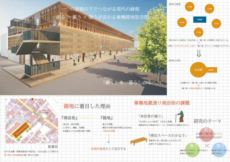 本研究は、生活と仕事が切り離されている現代の都市構造に着目し、生活圏の中に働く場を挿入する空間提案である。敷地は自身の生活圏である“巣鴨”に選定し、滞在と日常行為が自然に生まれる「路地」に働く場をつくる。建物には食堂や温泉を併設し、地域の人と自然に関わりながら、リラックスして過ごせる環境をつくる。働くことを特別な行為ではなく、生活の延長として捉え直し、人とのつながりを感じられる新しい働き方の風景を提示する。