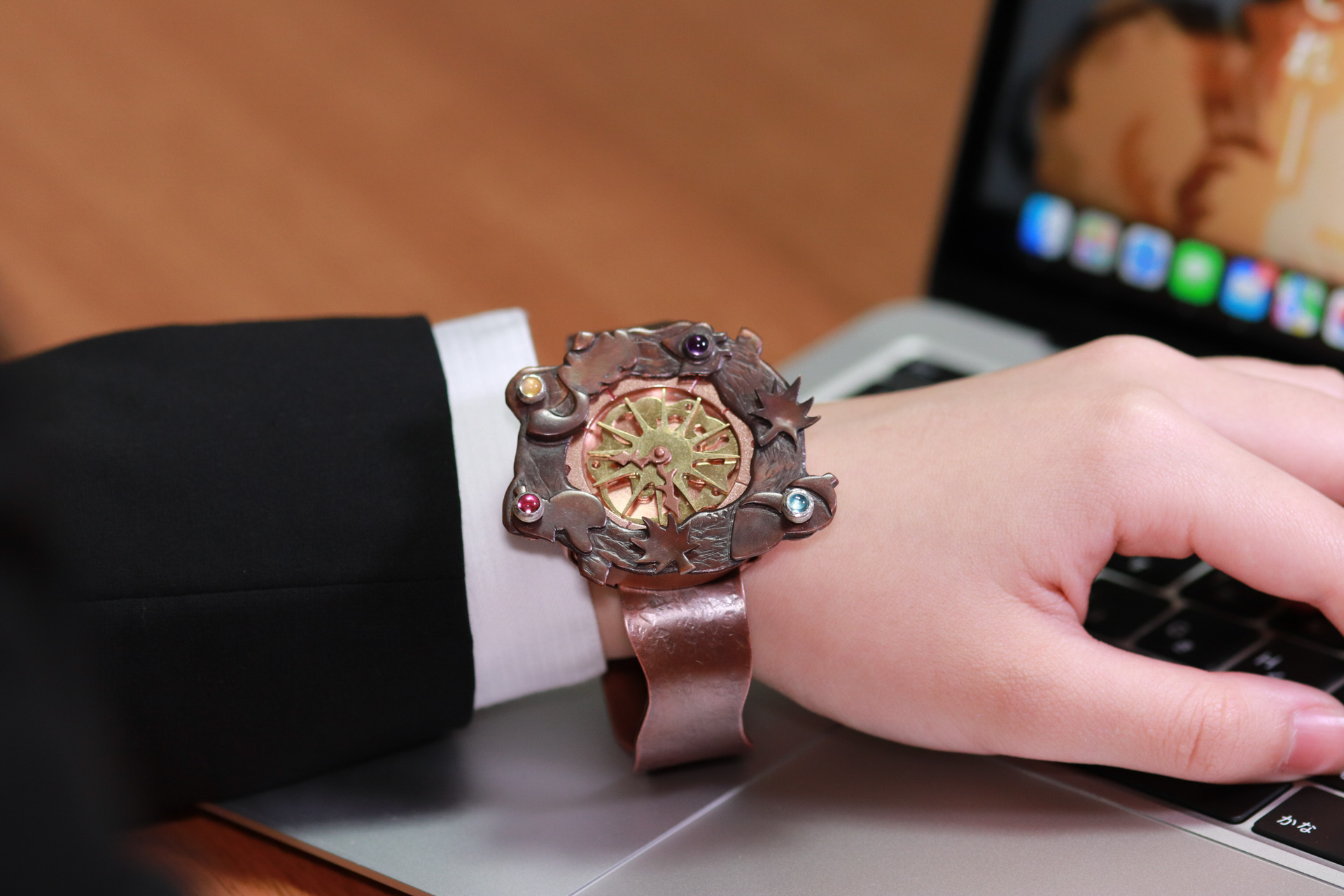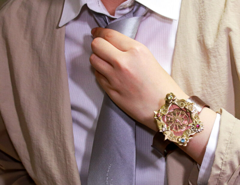 私は腕時計を時間を確認する道具ではなく、気分や季節を表現するアクセサリーとして捉え直した。春夏秋冬の季節をテーマに制作し、装飾を付け替えることによって、日常の変化を身にまとうことを目指している。また、作品名の時季は一定に流れる時間の中にある季節や心の移ろいを大切にしたいと考えたためである。