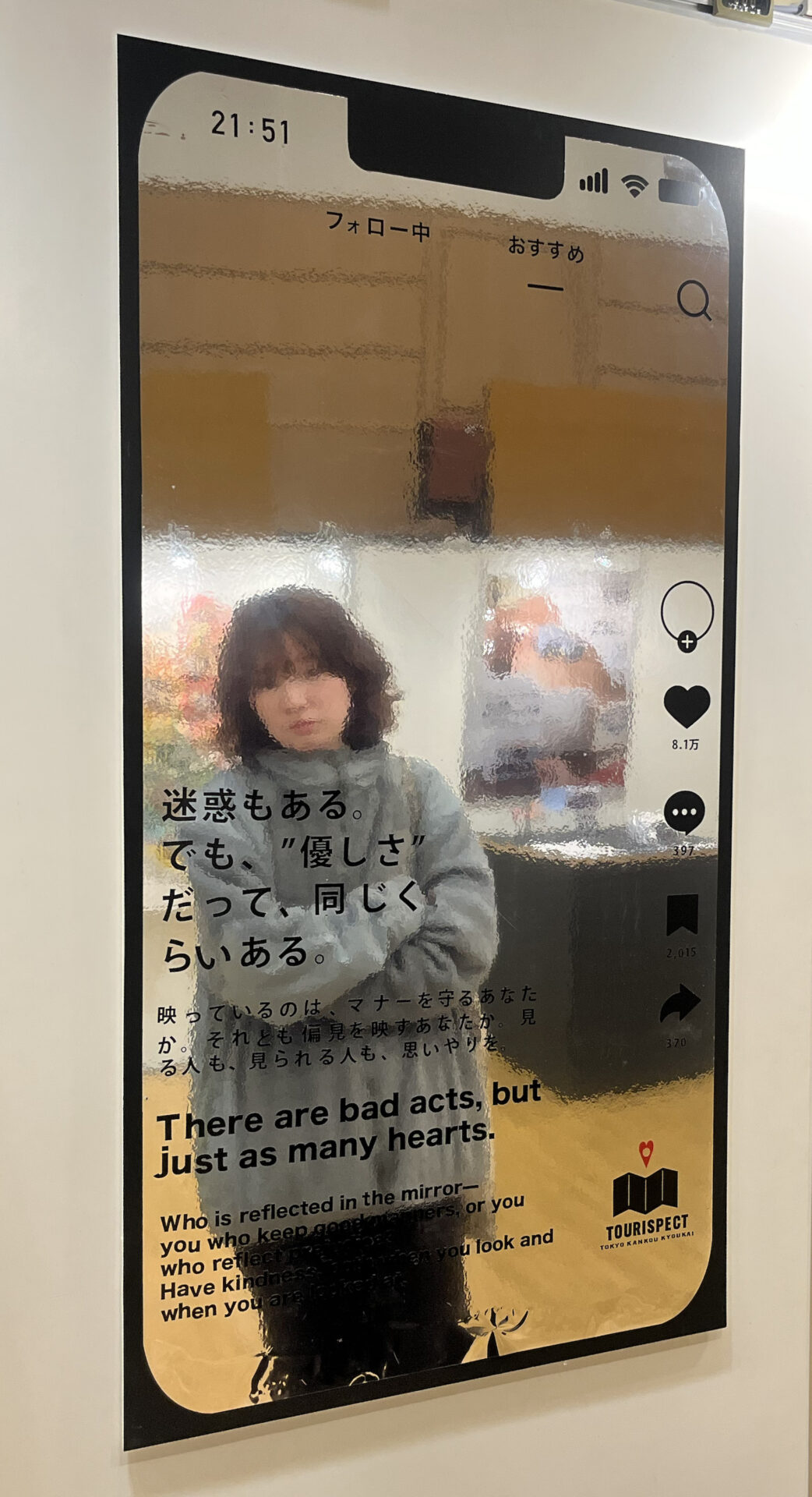 観光客に対してのポスターは、インバウンドで訪れた外国人観光客への日本人の偏見の削減と、観光客の迷惑行為防止を訴えています。素材を鏡面のように周囲を投影するメタリックな素材を使うことで、コピーが自分自身に向けて問いかけていることを想定しました。また鏡のように映ることで無意識に見てしまうのも狙いです。