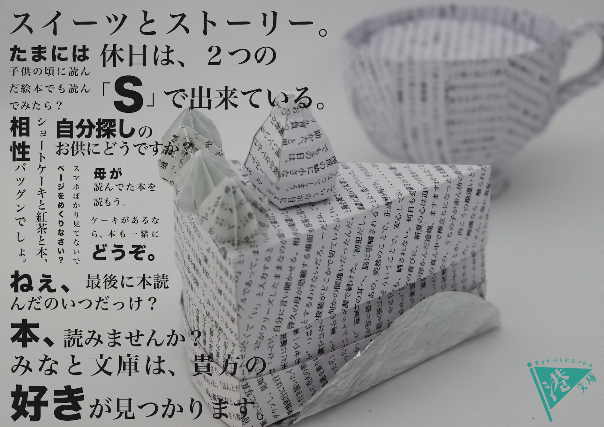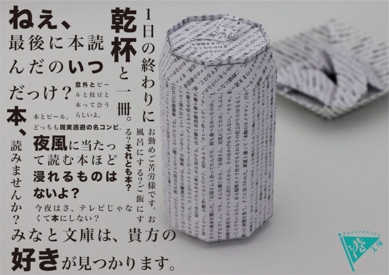 シリーズ1は、架空の出版社の広告です。大人になって読書をする時間がない人をターゲットとしました。休日などのちょっとした時間に本を手に取って貰えるように、モチーフとして仕事終わりの缶ビール、ちょっと贅沢したい時に食べるショートケーキを小説のページの紙を用いて制作した。コピーの配置は、文字を敷き詰めることによって、大量の文字に目が行くようにしました。