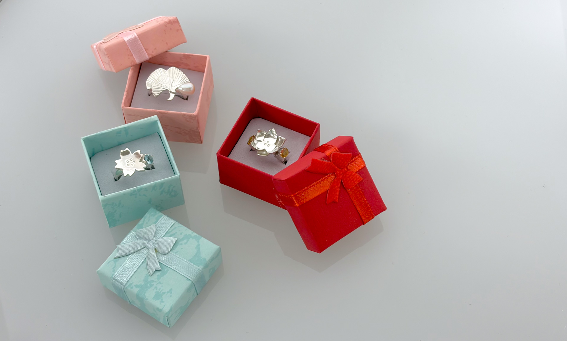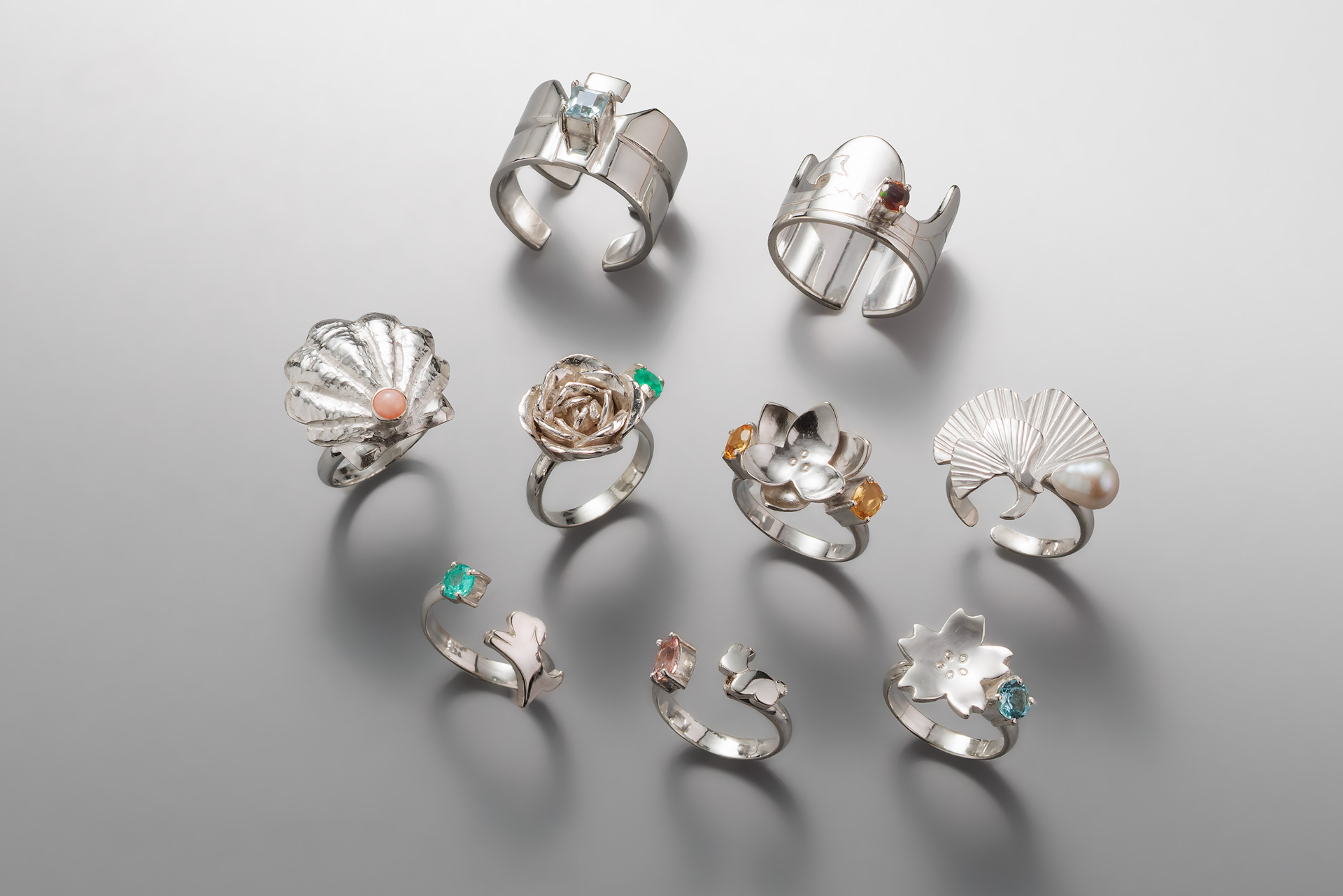 デザイン・造形学科 ジュエリー・メタルデザインコース 綾 感謝をテーマにしたジュエリーの制作 本橋 楓乃 アクセサリージュエリーリングロストワックスワックス宝石彫金石留め金属工芸金工銀鋳造鏨(タガネ) 作品仕様 作品仕様 彫金・鋳造/銀・半貴石 H15.7×W21.5×D21 (mm)他1点 H 7.7×W18.5×D19.9(mm)他6点 作品解説日頃からお世話になっている人たちに感謝を伝えるべく、計9点のジュエリーを制作した。相手の個性やイメージをもとに各リングのデザインを決定している。 ジュエリー・メタルデザインコース
