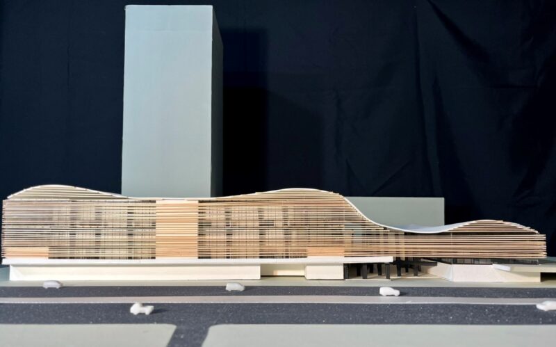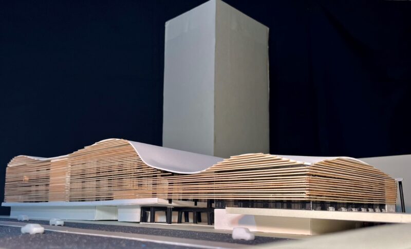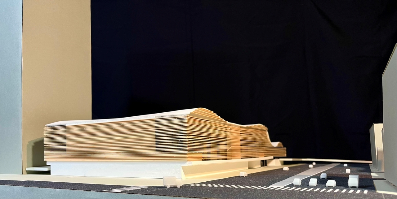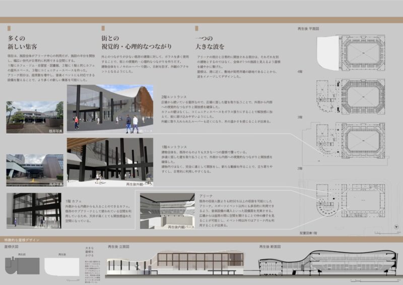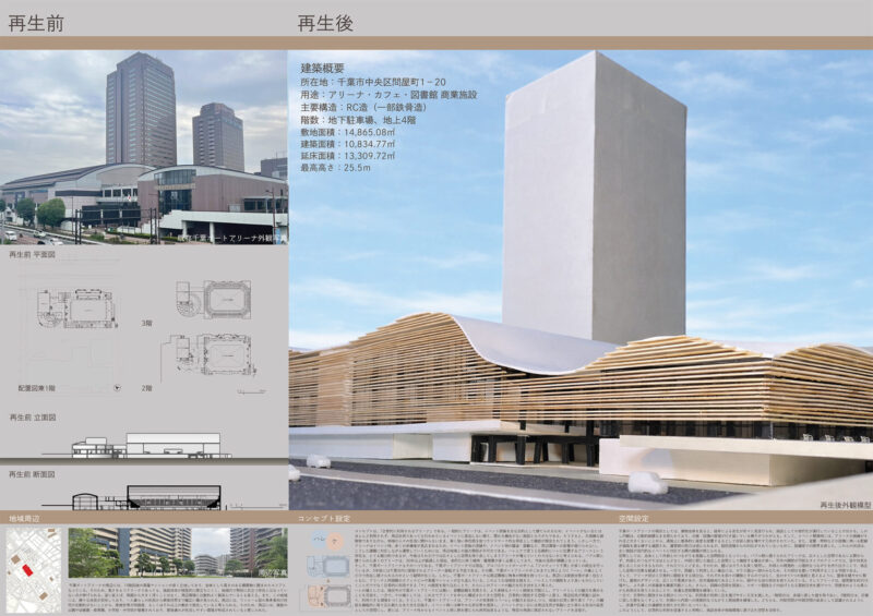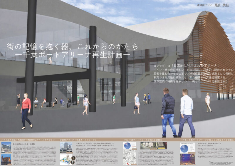 バブル期に建てられたアリーナは、非日常的な「ハレ」の空間として成立する一方で、日常から離れた存在となっていることが多い。 本制作では、千葉市の千葉ポートアリーナを対象に、閉じた空間を街へと開き、地域住民が生活の延長として利用できる施設へ再生する。 既存建築の特徴を継承しつつ、ガラスの多用やエントランスの開放によって街との関係をつくり、イベント利用と日常利用が重なり合う構成とすることで、新たな多目的アリーナの在り方を提案する。