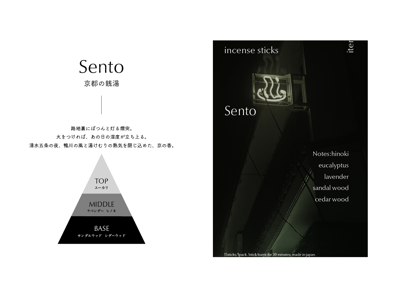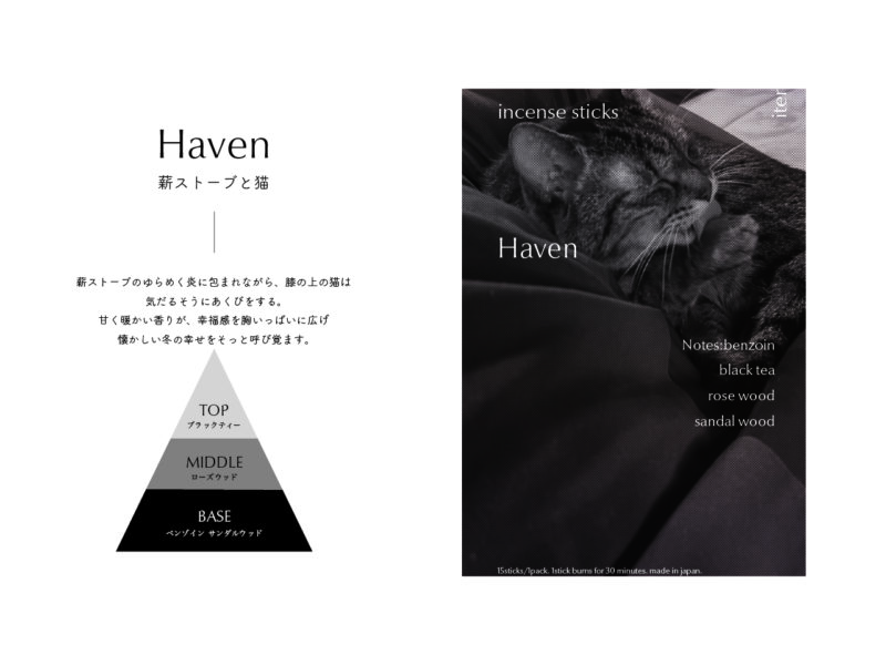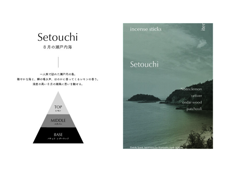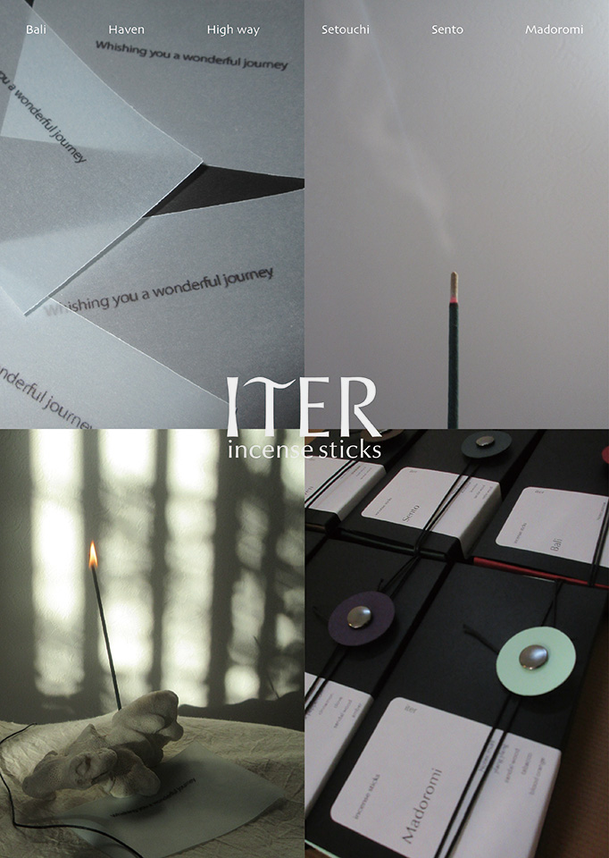 ふとした瞬間に感じた香りで過去の記憶が呼び起こされる感覚を、焚く過程で五感に働きかける体験が伴うお香としてかたちにした。 お香ブランド“iter”のコンセプトは、「非日常のひとときも、ふとした懐かしさも、香りが呼び起こす記憶はあなただけの宝物になる」。大学生活の集大成として、”今だからつくれるもの“をと、4年間の記憶の中で特に印象に残っている6つの香りをオリジナルで調香し、成形したお香とパッケージを制作した。