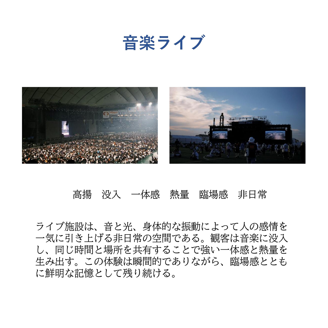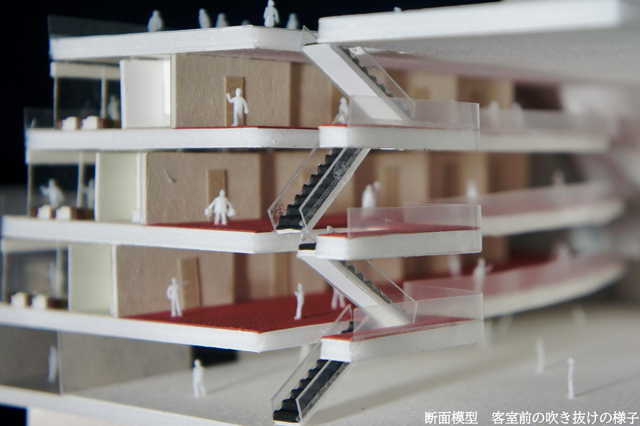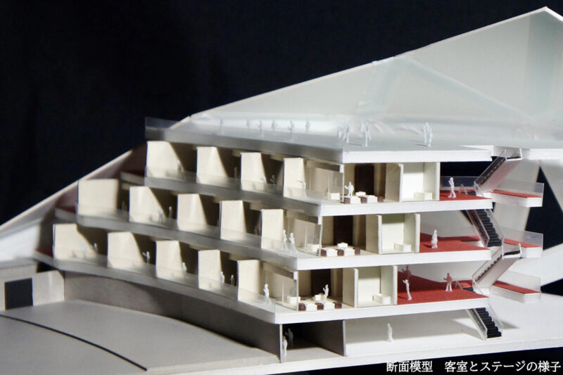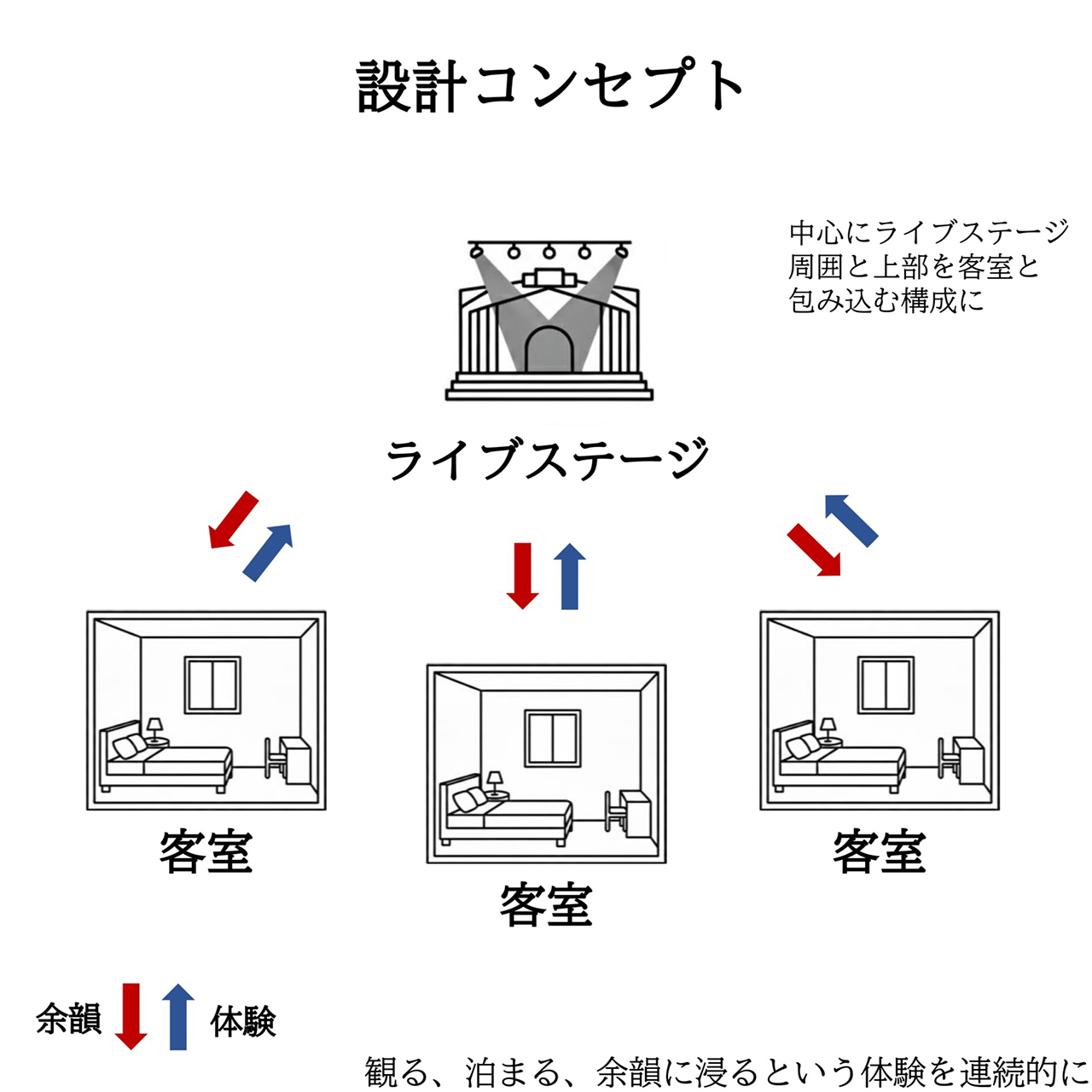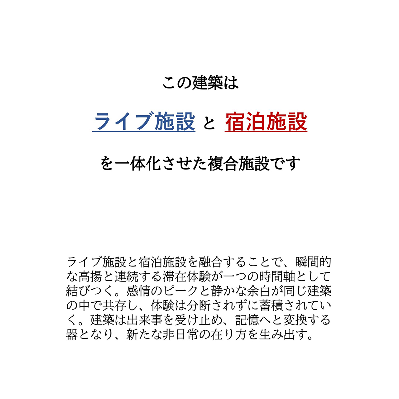建築デザインコース 響宴の余白 市川塩浜臨海音響宿泊施設営造計画 佐野 光 制作 宿泊施設展示・鑑賞施設複合施設都市音 作品仕様 作品解説本計画はライブによって生まれる高揚感と、その後に訪れる静かな余韻を断絶させることなく、建築空間として連続させることを目指した。中央に配置した音響ホールを核とし、その周囲を宿泊機能が取り囲む構成とすることで、音楽体験が建築全体に滲み出すような空間を形成している。また、臨海部特有の開放感を取り込み、都市の中にありながら非日常的な場を創出する。 研究背景・コンセプト 図面 本体模型 断面模型 建築デザインコース