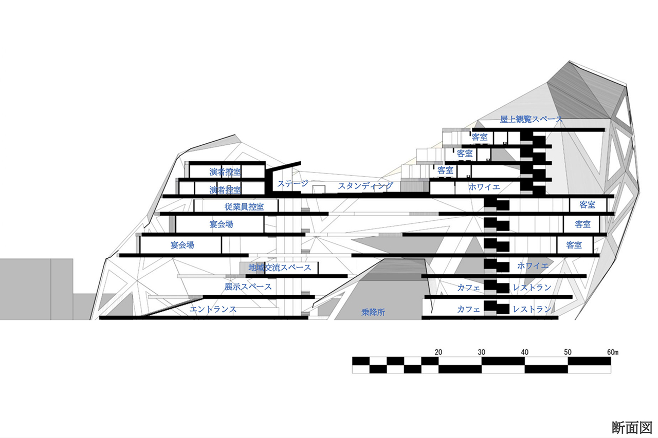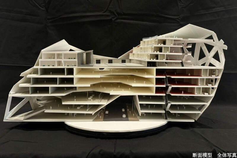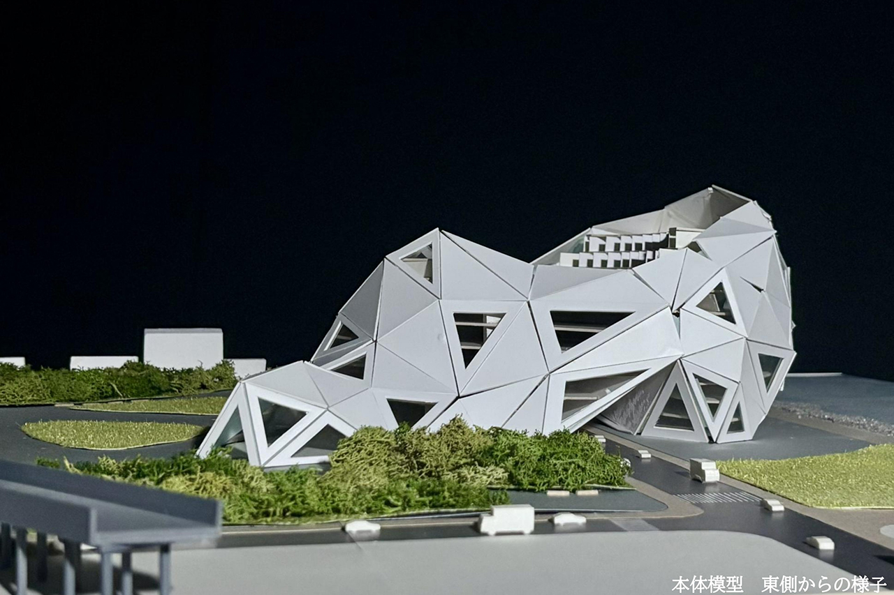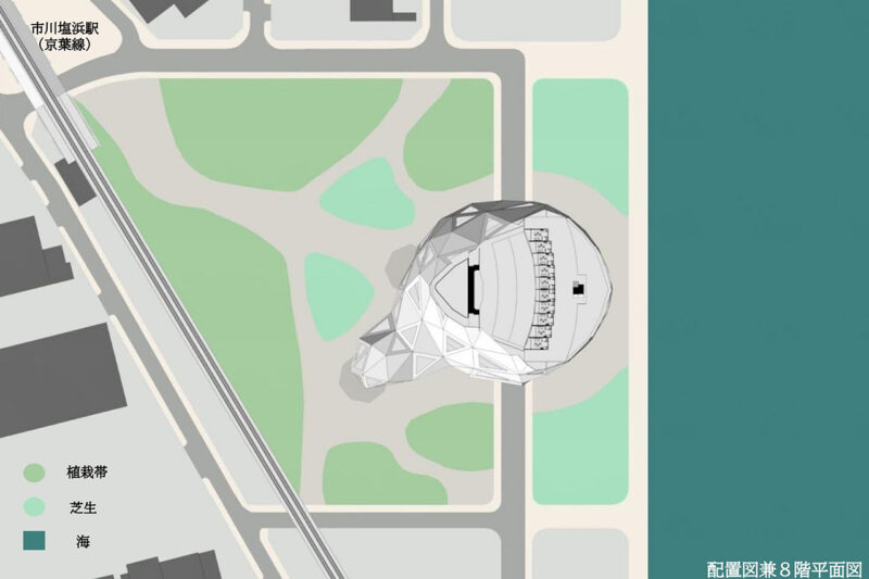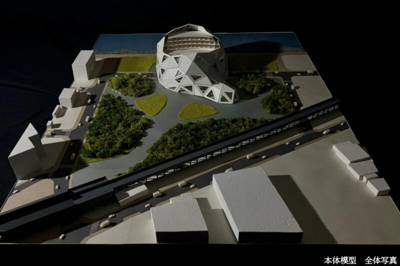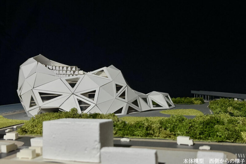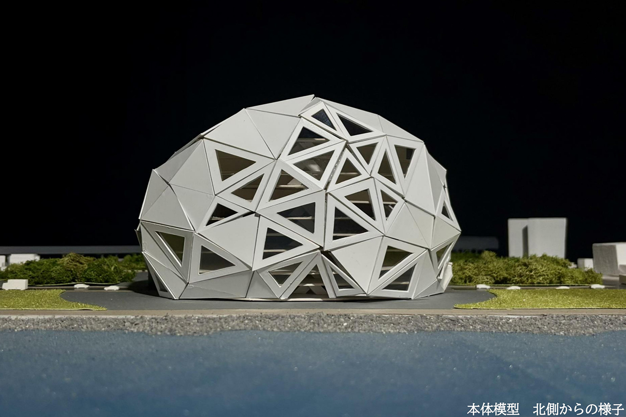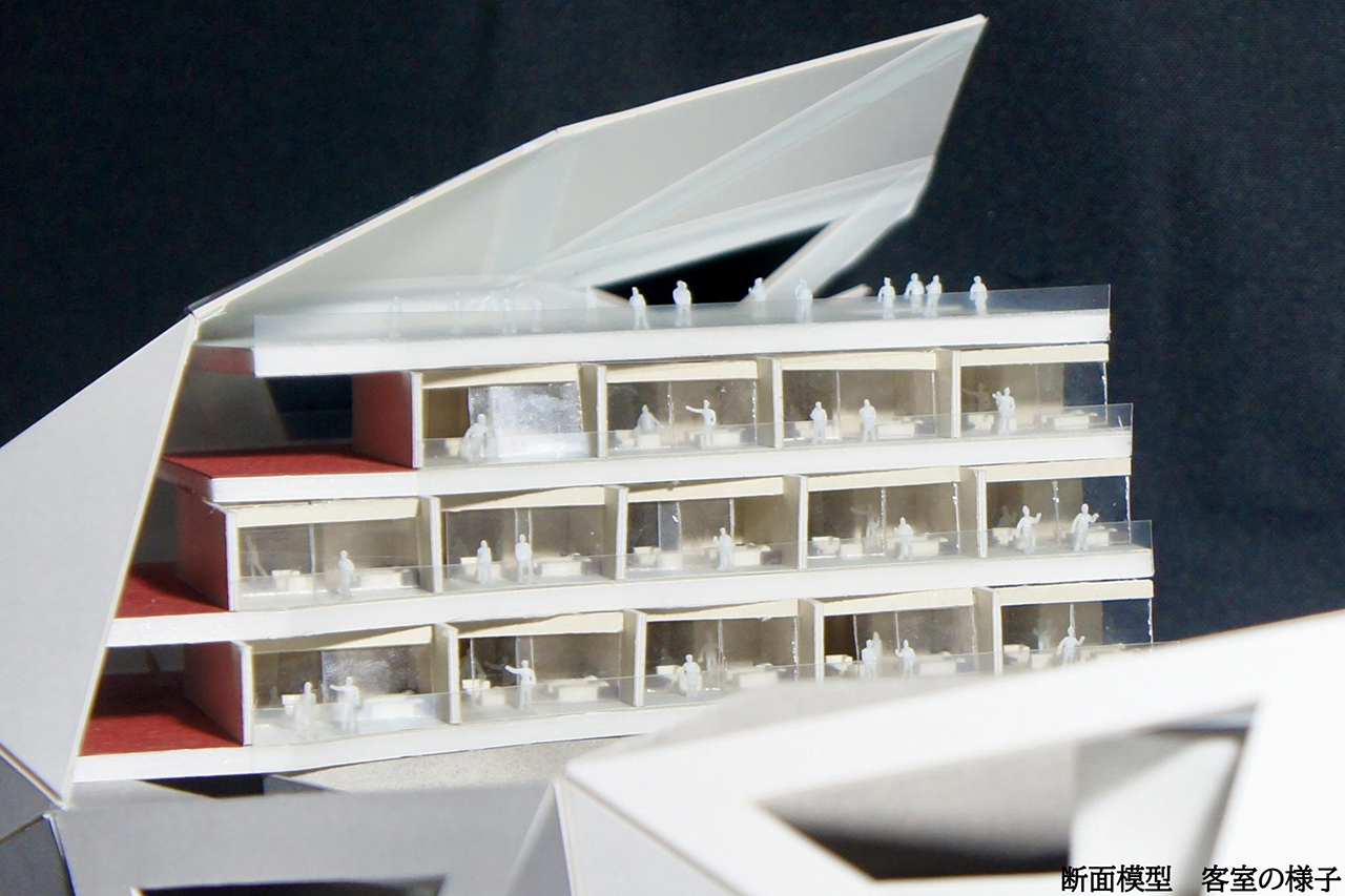 建築デザインコース 響宴の余白 市川塩浜臨海音響宿泊施設営造計画 佐野 光 制作 宿泊施設展示・鑑賞施設複合施設都市音 作品仕様 作品解説本計画はライブによって生まれる高揚感と、その後に訪れる静かな余韻を断絶させることなく、建築空間として連続させることを目指した。中央に配置した音響ホールを核とし、その周囲を宿泊機能が取り囲む構成とすることで、音楽体験が建築全体に滲み出すような空間を形成している。また、臨海部特有の開放感を取り込み、都市の中にありながら非日常的な場を創出する。 研究背景・コンセプト 図面 本体模型 断面模型 建築デザインコース