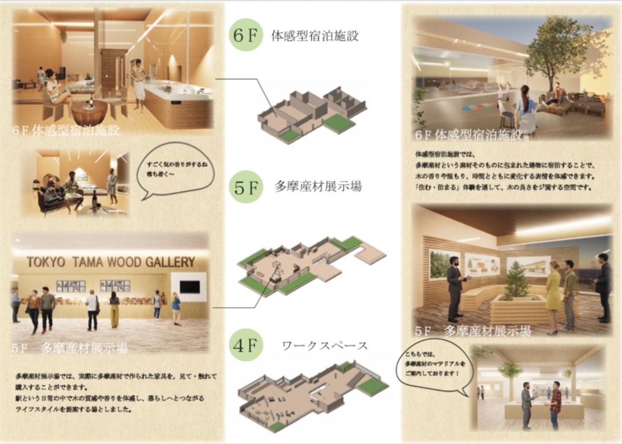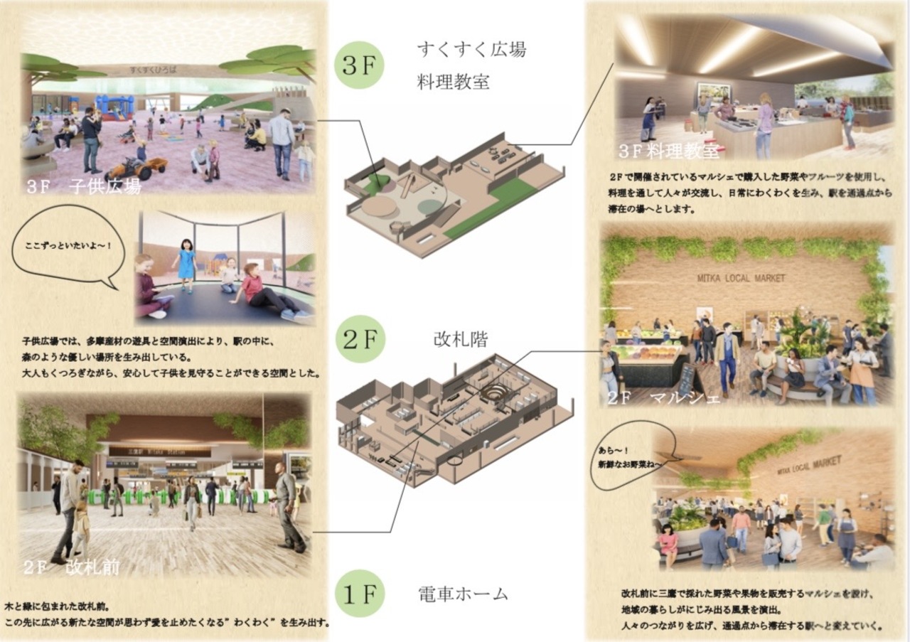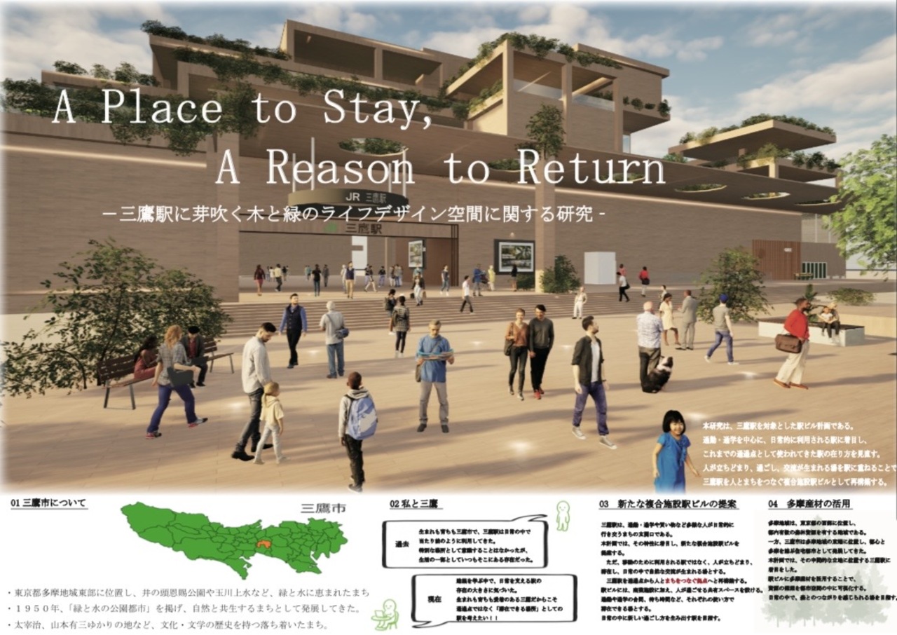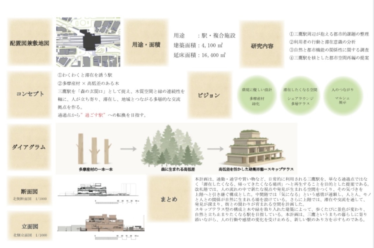 本計画は、三鷹駅を「通過する場所」から「滞在したくなる場所」へと再生する提案である。多摩産材を用いた木質空間と緑を取り入れ、駅全体を森のように構成した。高低差のあるスキップテラスによって、移動の中に発見や立ち止まるきっかけを生み出し、人と人、日常と自然が緩やかにつながる駅を目指している。三鷹らしい穏やかさを守りながら、新たな居場所となる駅のあり方を示した。