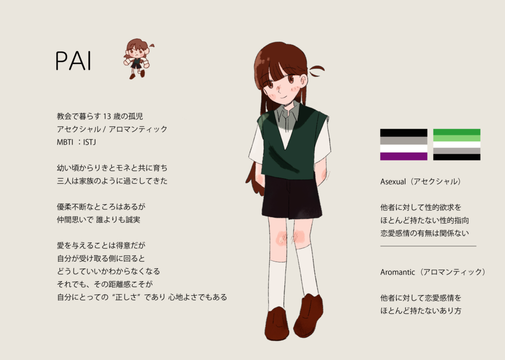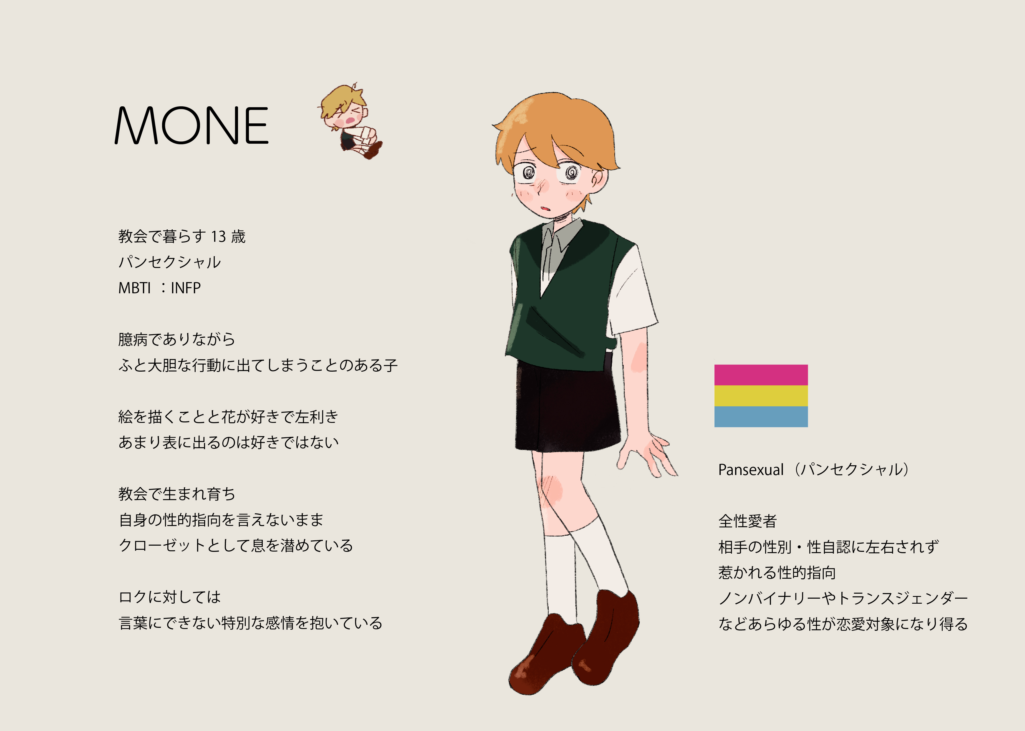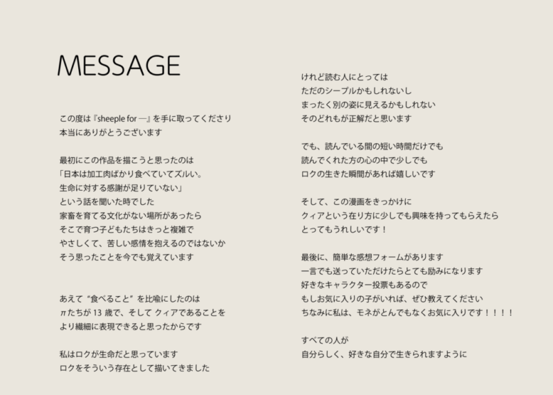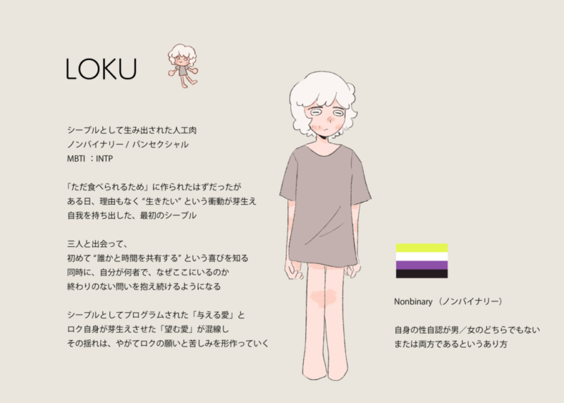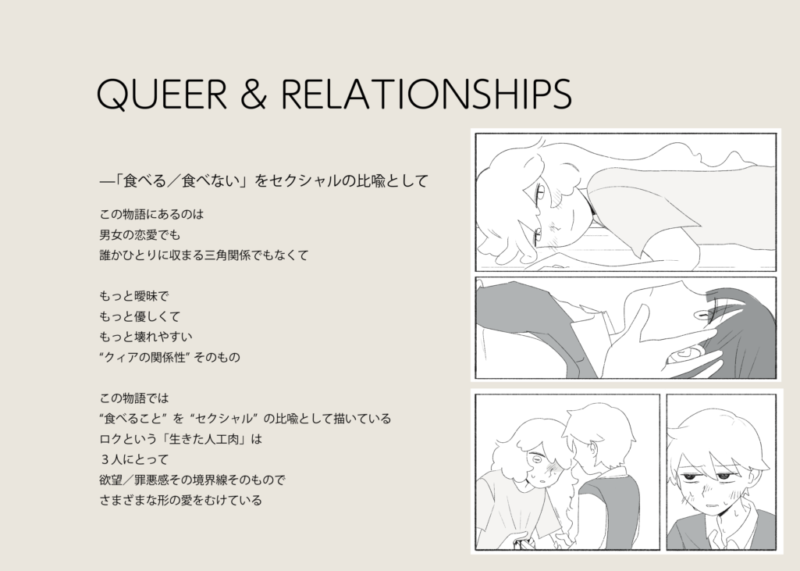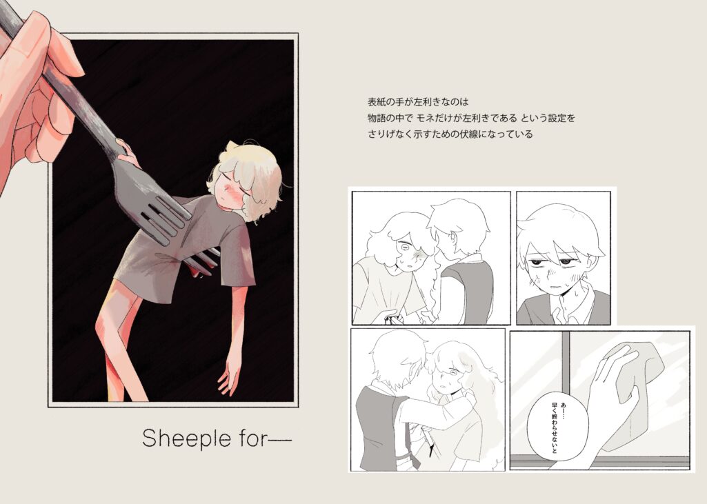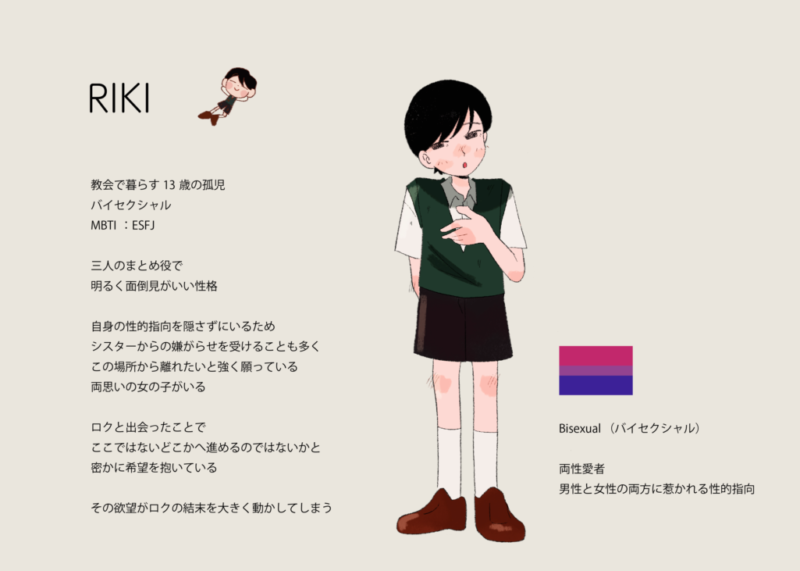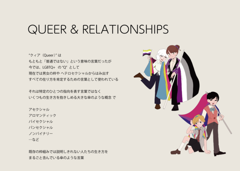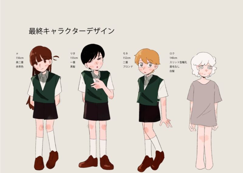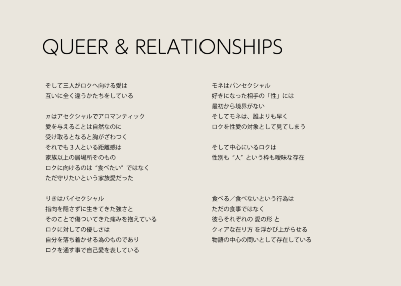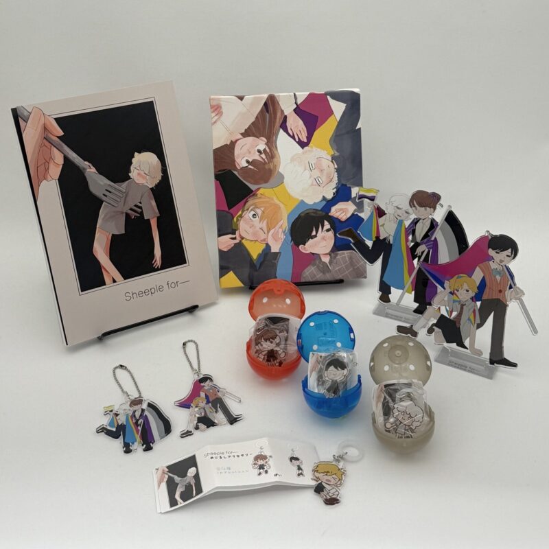 本作品は、クィアを題材にした物語を通して、より多くの人がセクシャルの多様性に触れるきっかけをつくりたいという思いから制作した。多くの人に伝えられるようなキャラクター作りと漫画の展開を行い、親しみを持って受け取ってもらえる表現を意識している。漫画で構築したキャラクターとストーリーを起点に、その世界観を日常的に手に取れる形へと広げるため、派生したグッズ制作を行った。物語とプロダクトの両面から、多様な価値観に触れる入口となることを目指している。