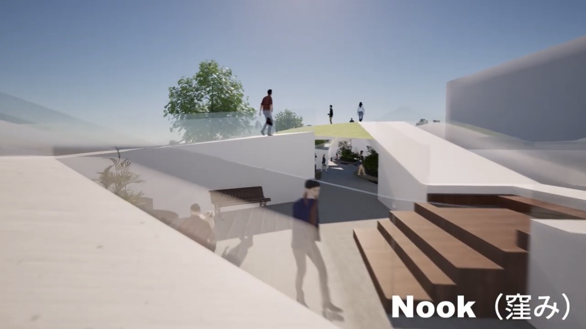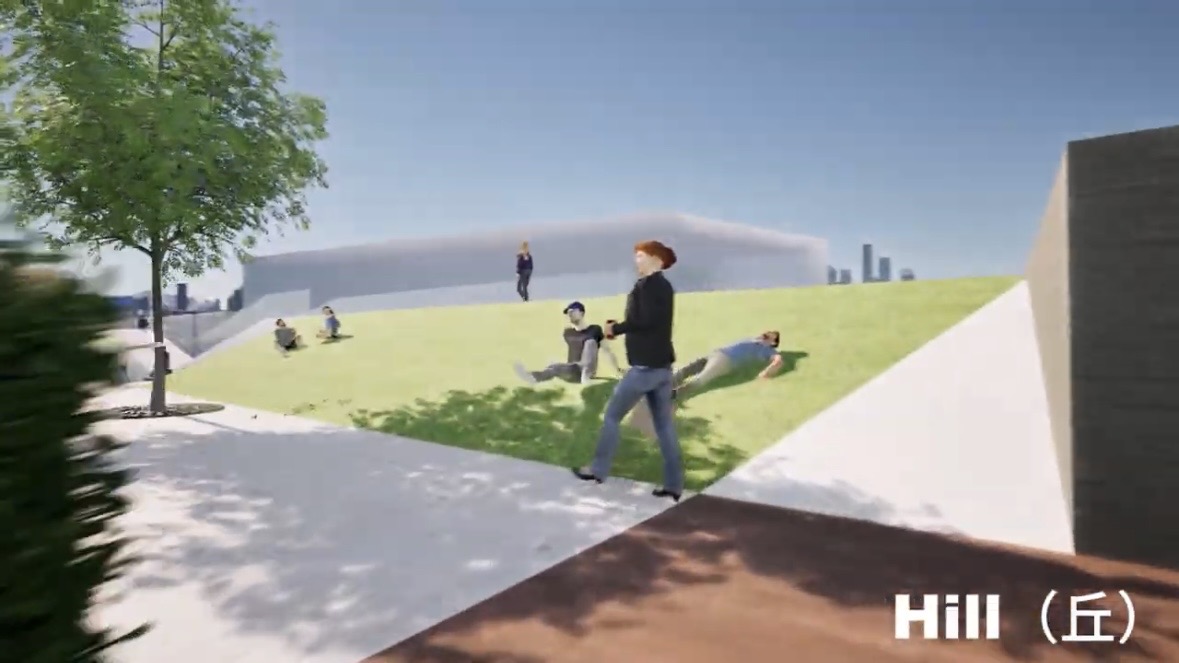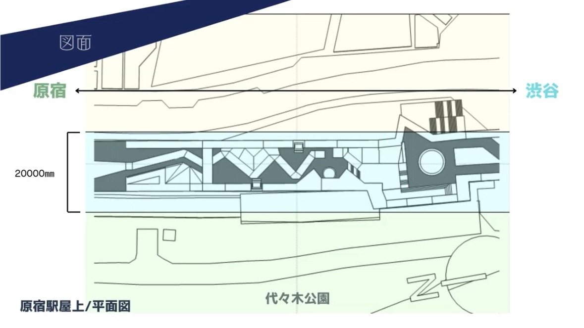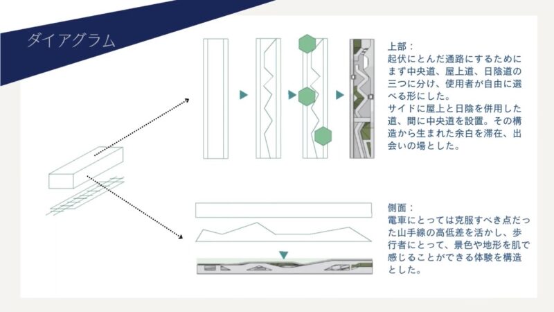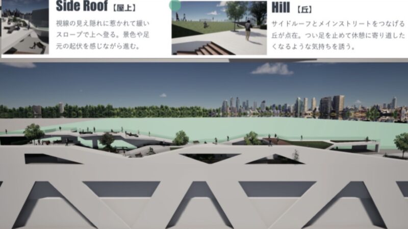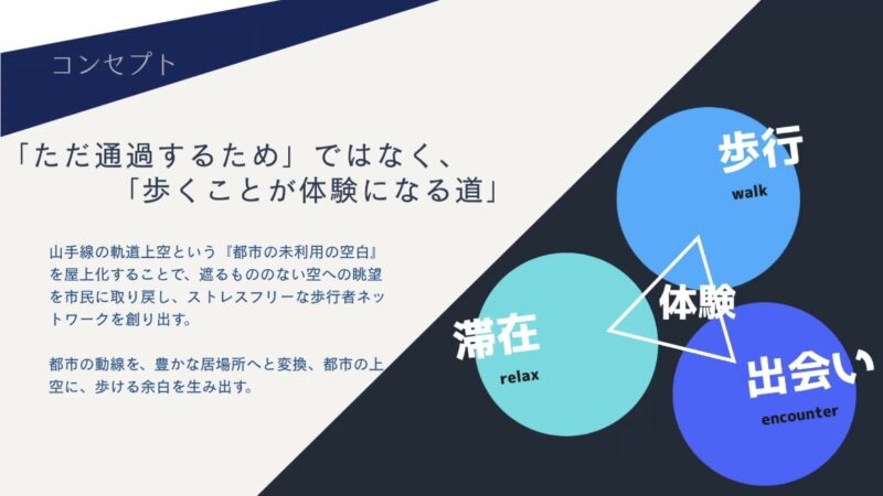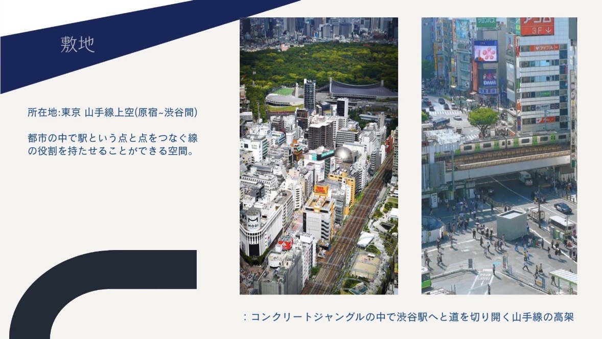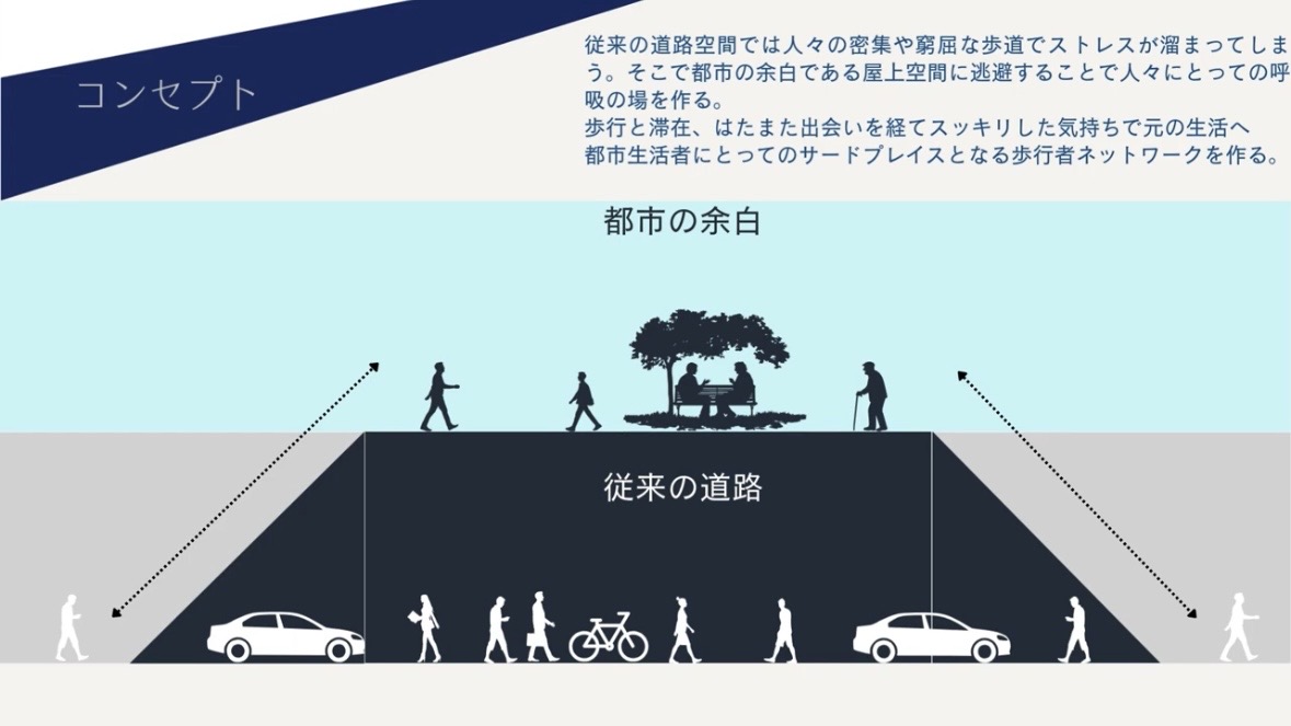 東京の都市空間は常に歩き続けることでそのキャパシティを保っている。一方で、立ち止まり、呼吸し、空を見上げるための余白は驚くほど少ない。再開発が進み、地上空間がますます過密化する都市生活者に遮るもののない空への眺望を取り戻し、ストレスフリーな歩行者ネットワークを創り出す。山手線上空約7mに展開するこの屋上は、都市の混雑や騒音から距離を取りつつ、歩行と滞在をシームレスに連続させることで、歩くことそのものが体験となる都市の点と点を結ぶ道となり、偶発的な出会いや活動を受け止める文化の場となる。