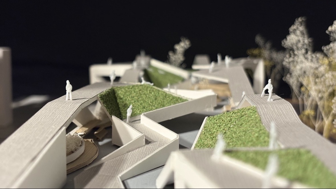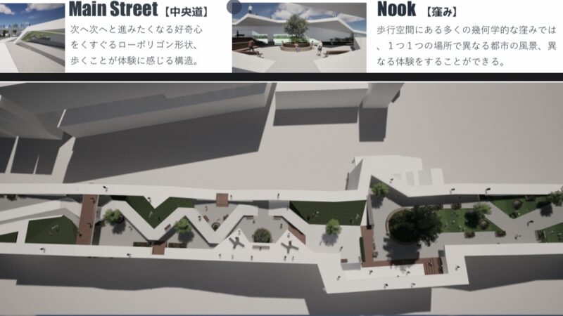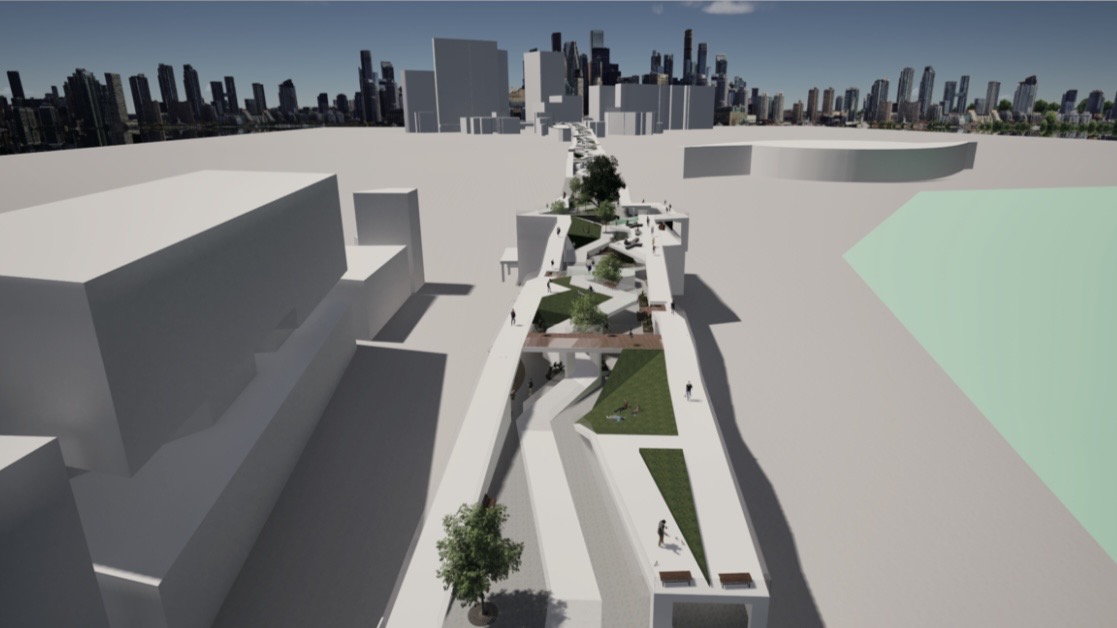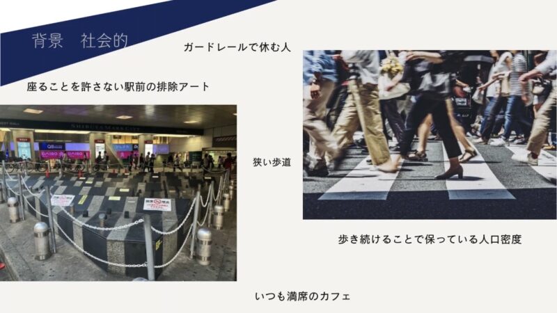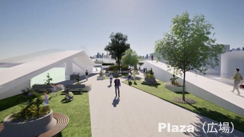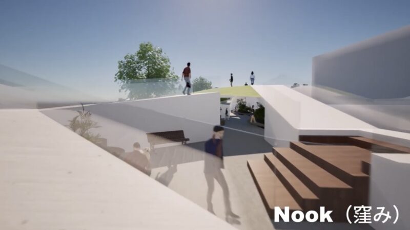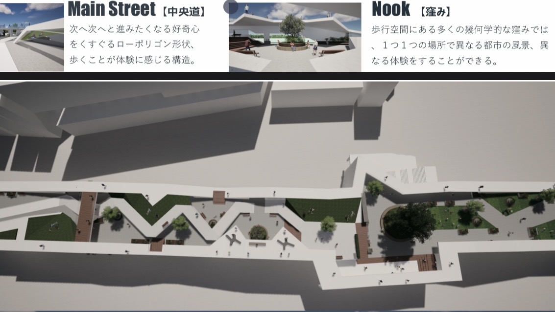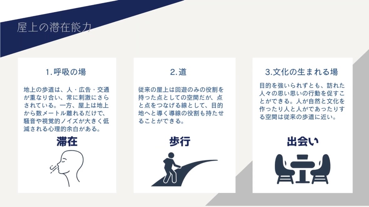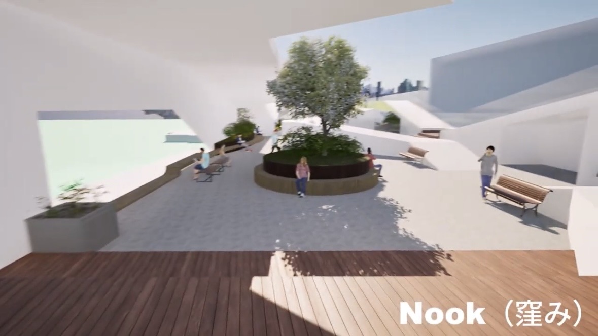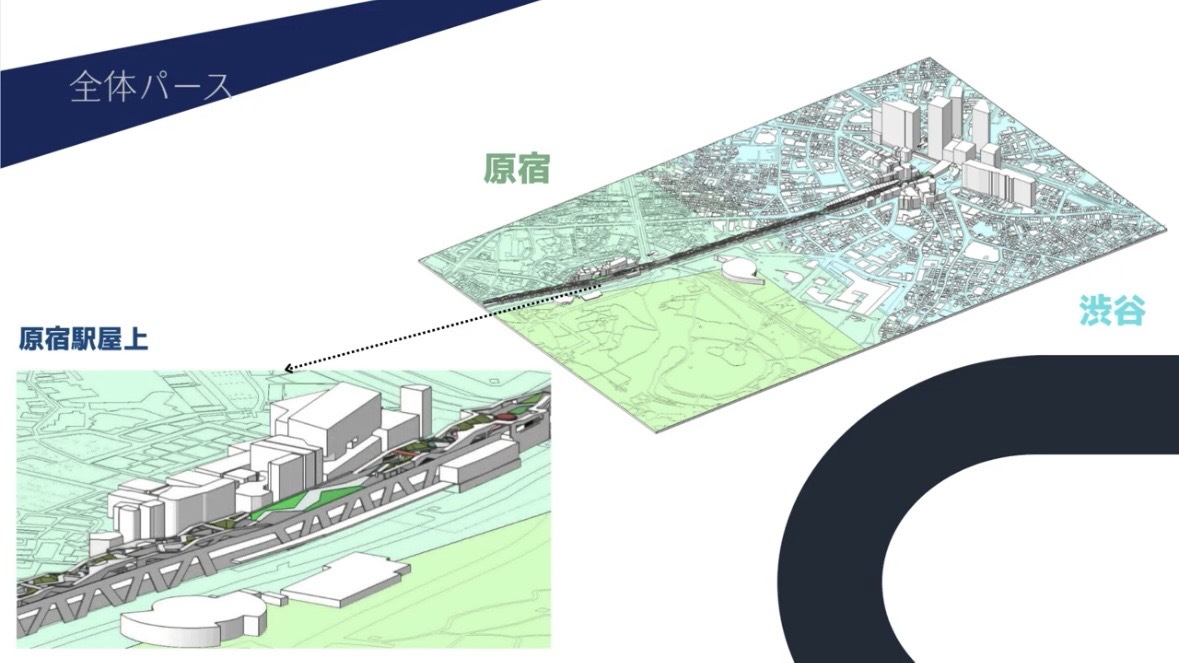 東京の都市空間は常に歩き続けることでそのキャパシティを保っている。一方で、立ち止まり、呼吸し、空を見上げるための余白は驚くほど少ない。再開発が進み、地上空間がますます過密化する都市生活者に遮るもののない空への眺望を取り戻し、ストレスフリーな歩行者ネットワークを創り出す。山手線上空約7mに展開するこの屋上は、都市の混雑や騒音から距離を取りつつ、歩行と滞在をシームレスに連続させることで、歩くことそのものが体験となる都市の点と点を結ぶ道となり、偶発的な出会いや活動を受け止める文化の場となる。
