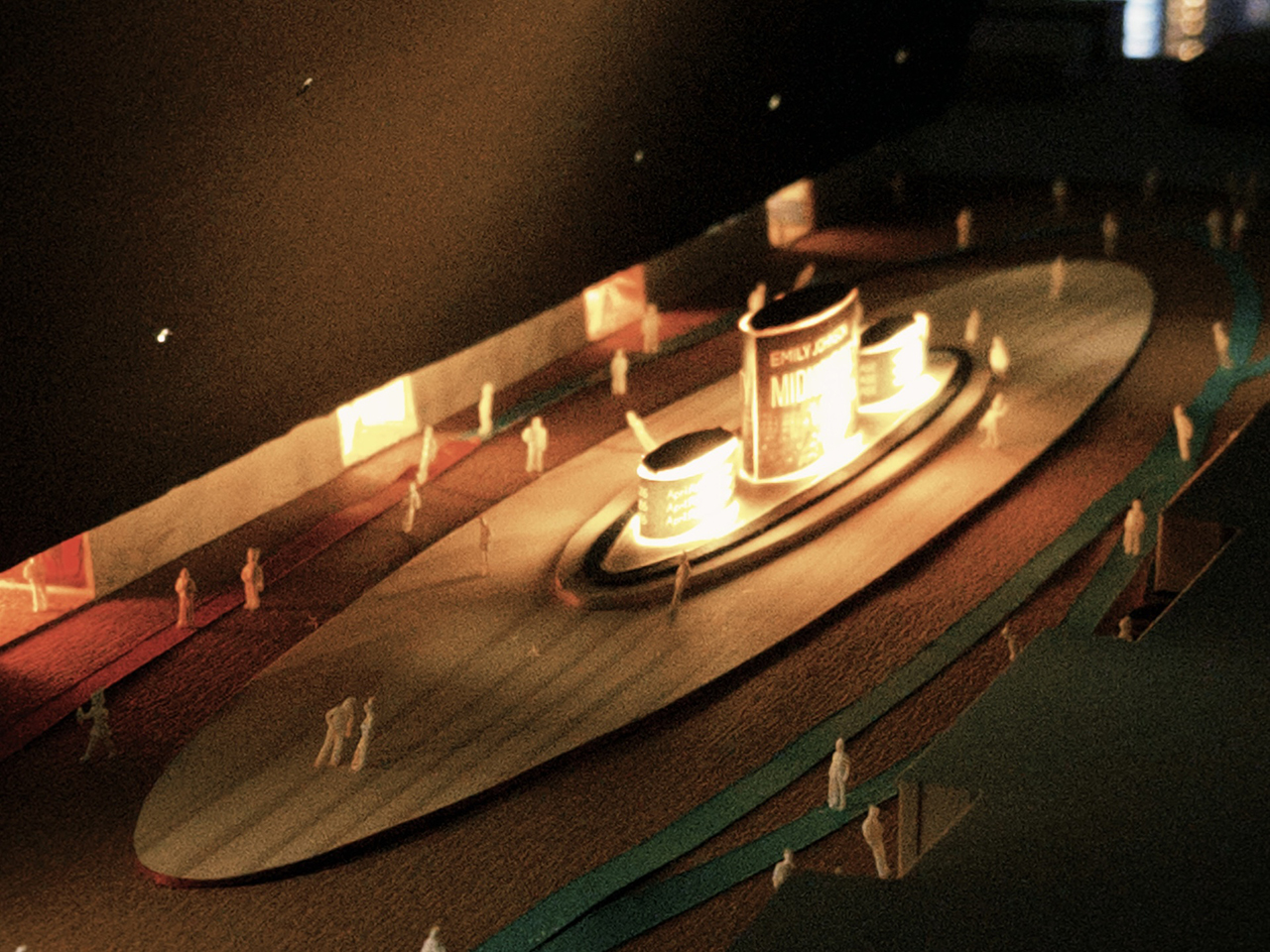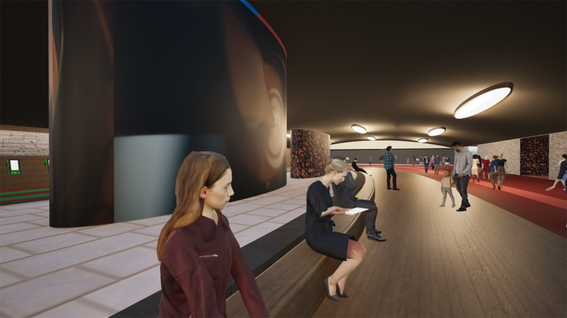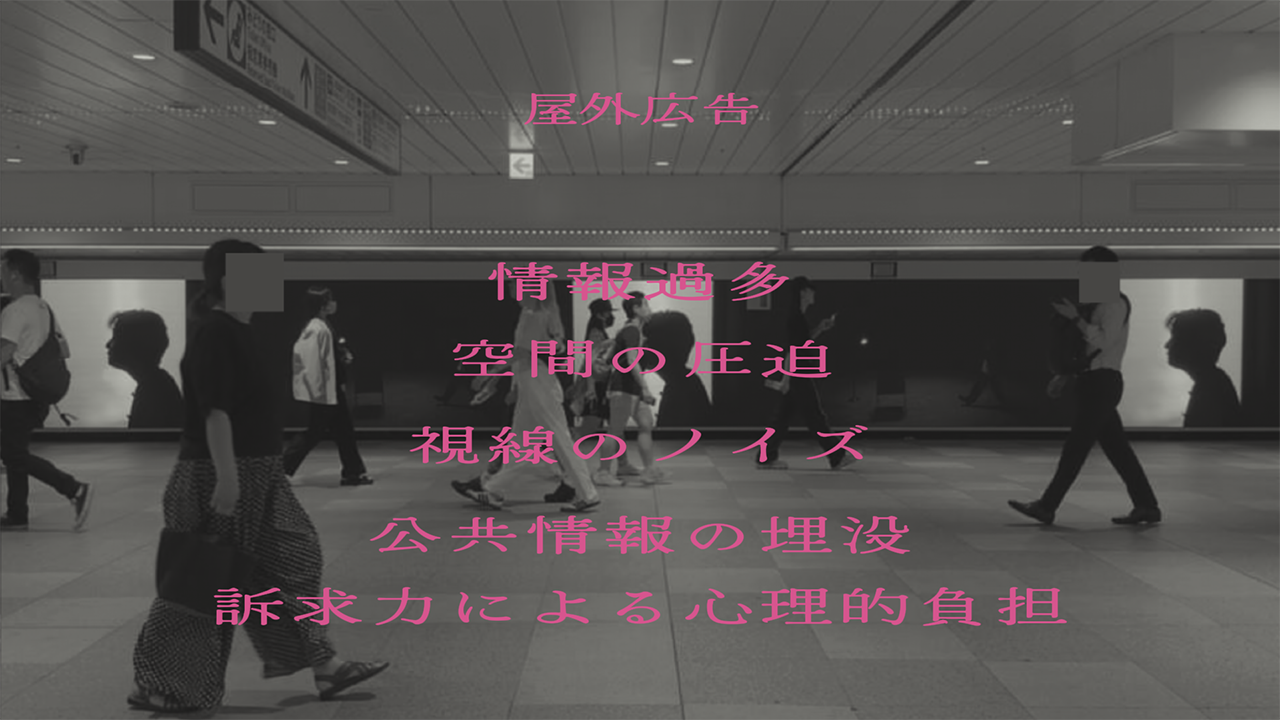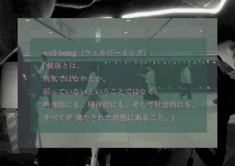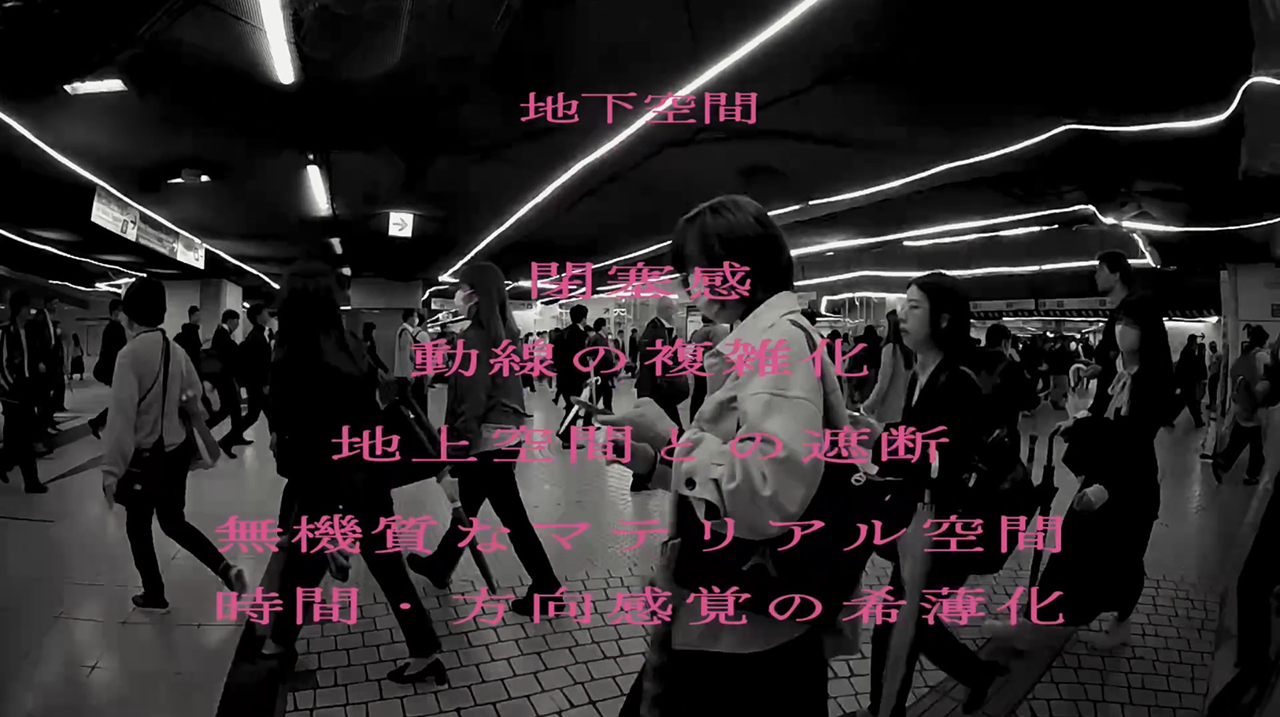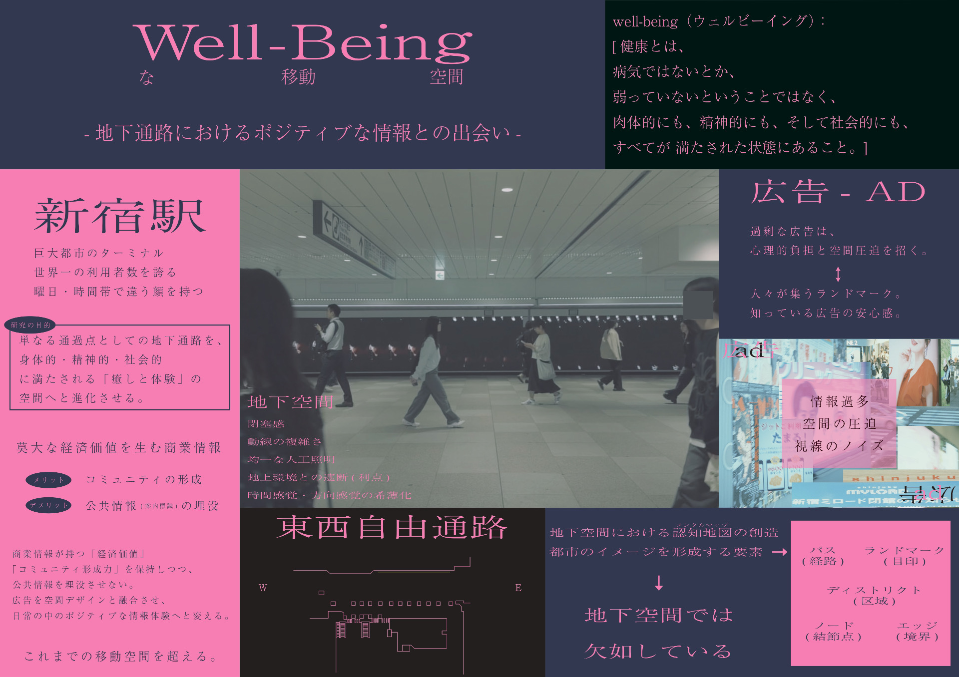 新宿駅地下空間は、経済価値やコミュニティを育む商業情報が氾濫し、公共情報が埋没する矛盾を抱える。本作品は、広告の「心理的負担」と「都市の活気」という二面性を空間設計に融合。情報をノイズではなく、認知を助けるランドマークとして情報デザインを空間へ落とし込んだ。情報の役割を転換し、日常の移動をストレスから解放。心身・社会的に健康で、癒しのある「Well-beingな移動空間」を創出した。